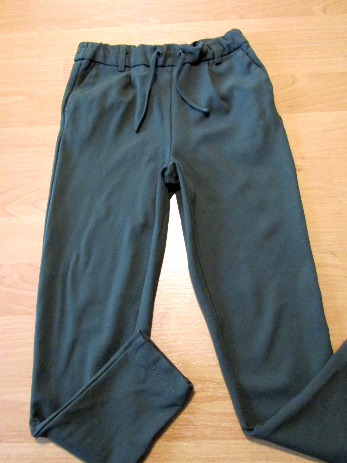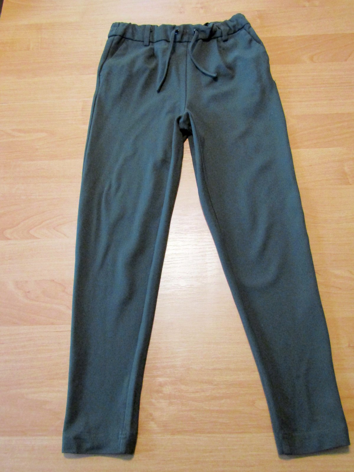 Plátěné kalhoty, v pase na gumu a šňůrku. Kapsy na bocích i nohavicích. Nohavice na gumu. Velikost uvedena 150, ale jsou spíš kratší, proto uvádím velikost 140. Jsou velmi pohodlné, bez vad, vzhled...