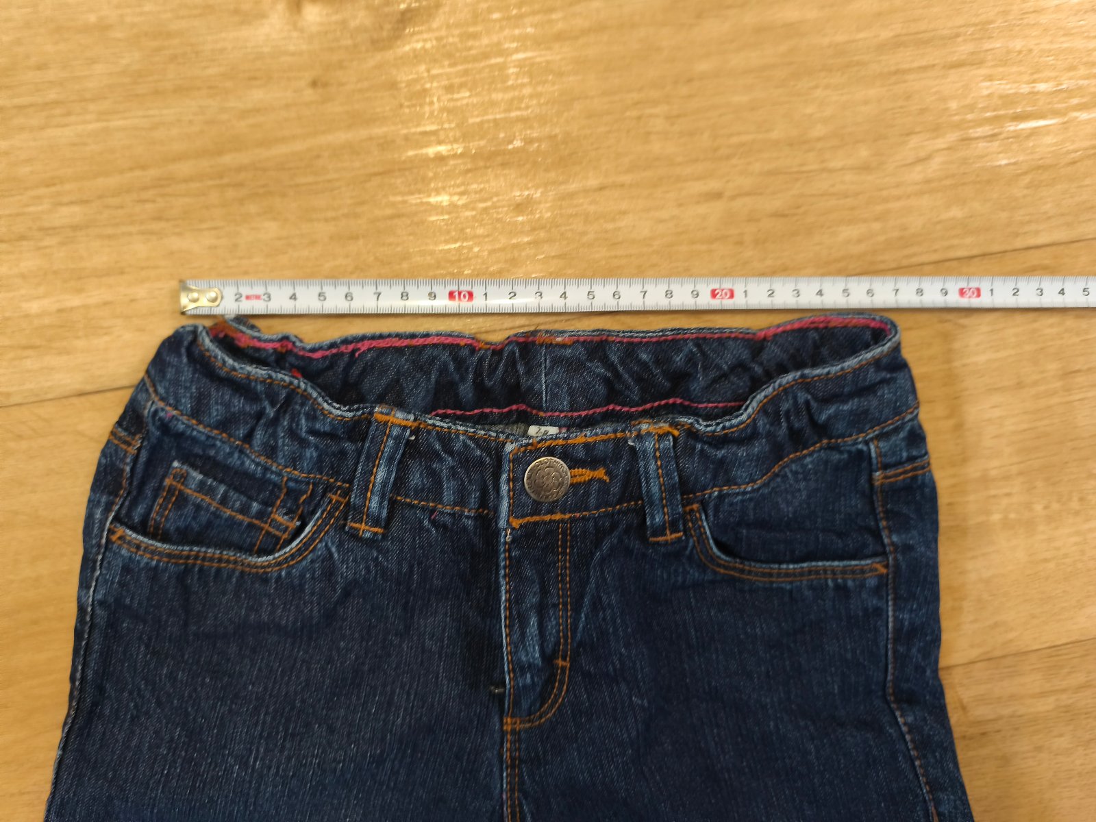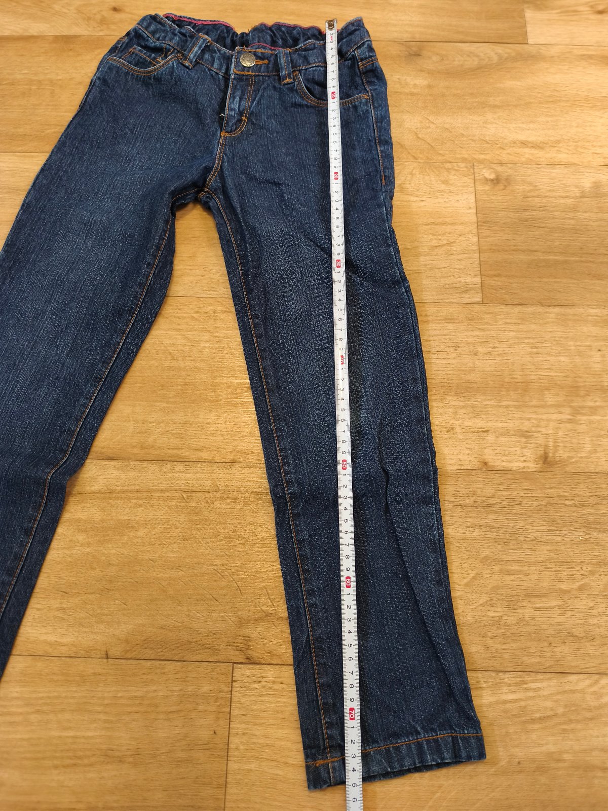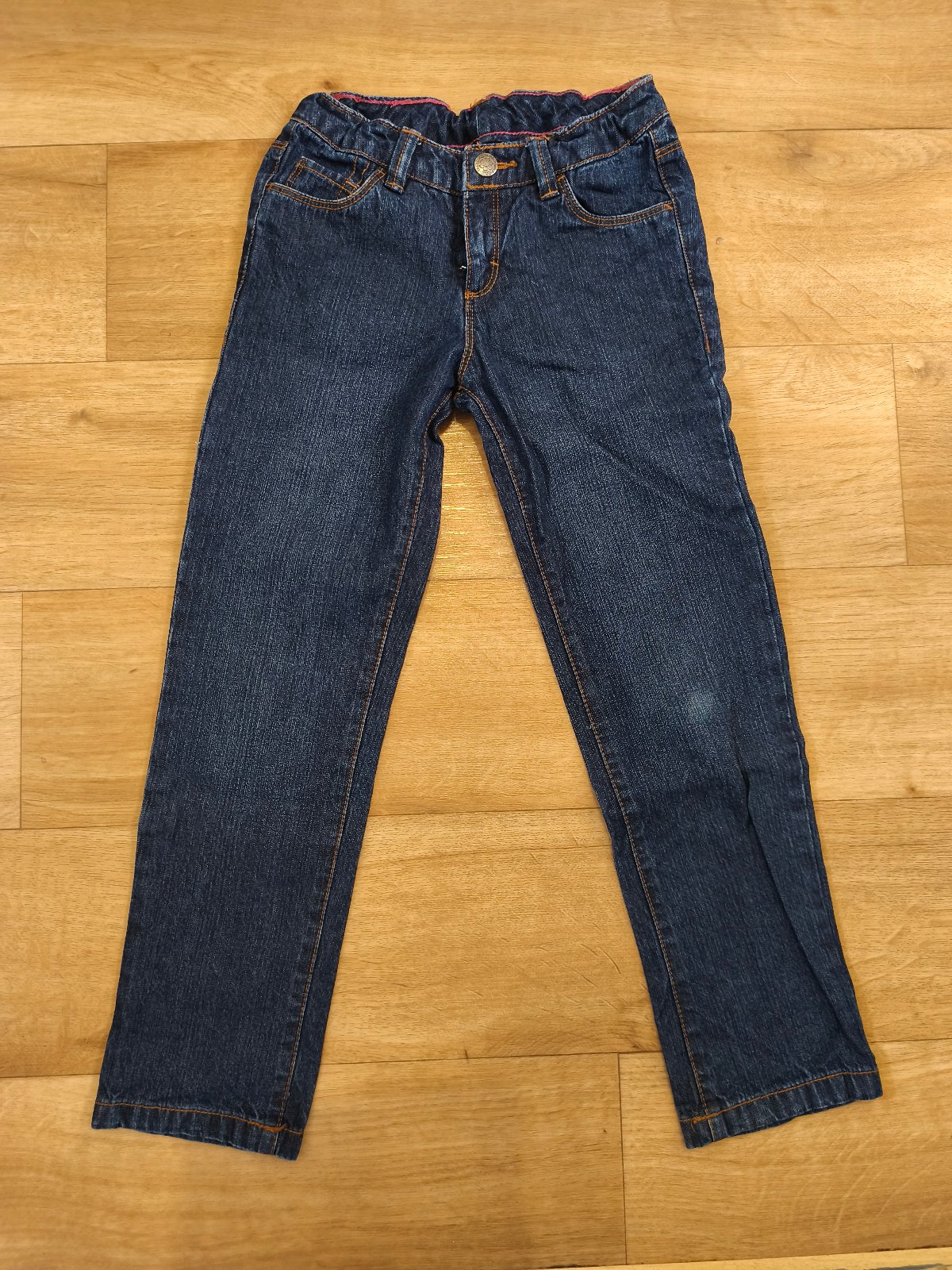 Džíny velikost 7/8 let - rozměry a stav na fotkách. Regulace v pase. Zevnitř prošito růžovou nití, ale zvenku není patrná.