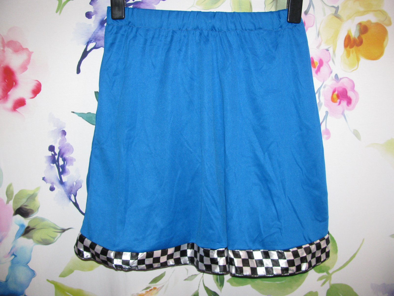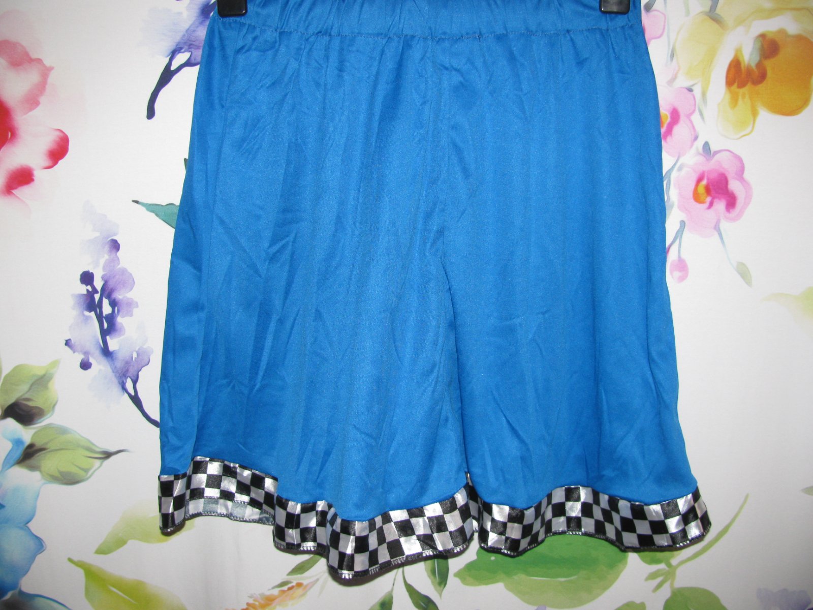 Elastická modrá sukně, v pase do gumy, 100% polyester.