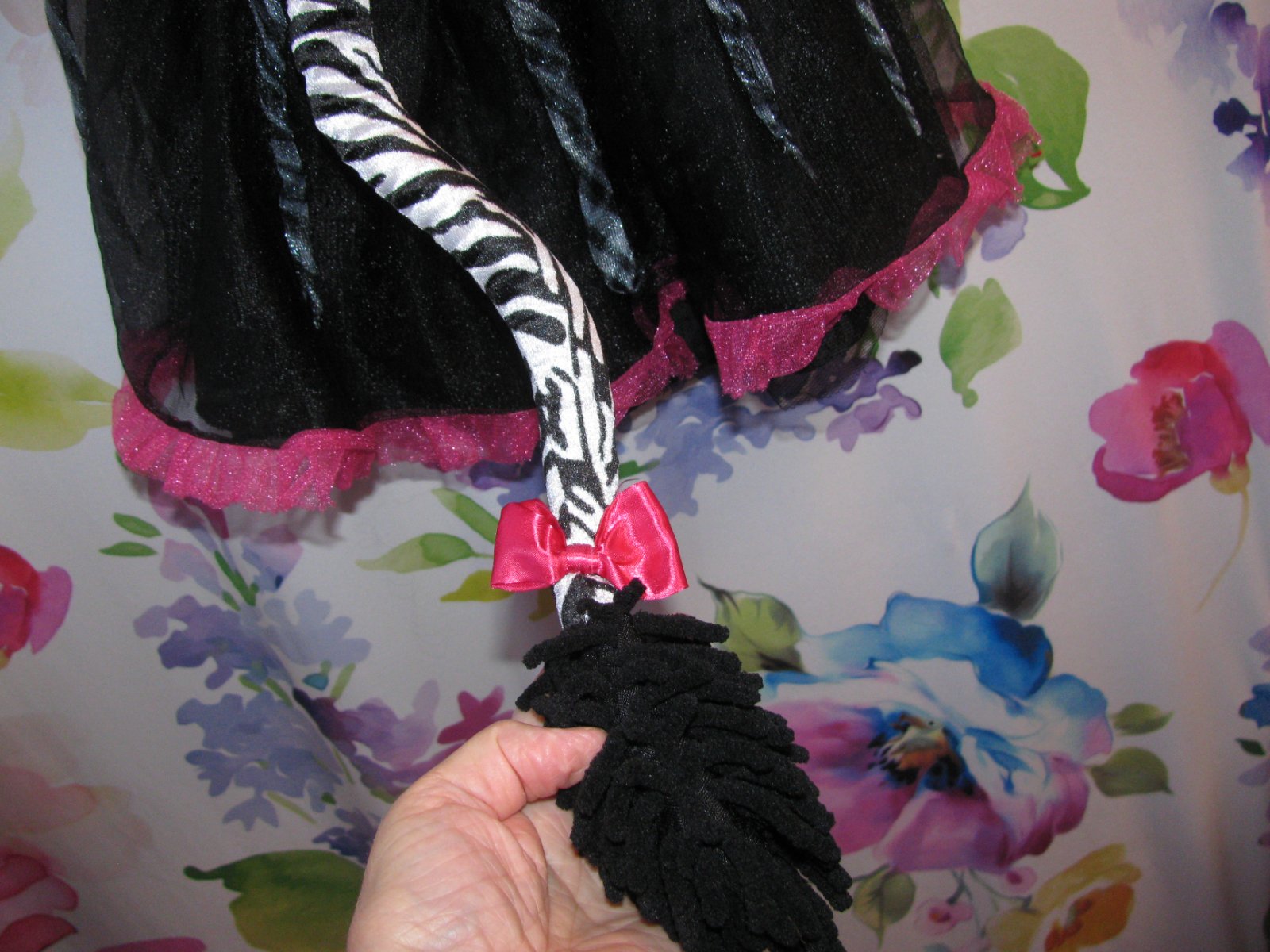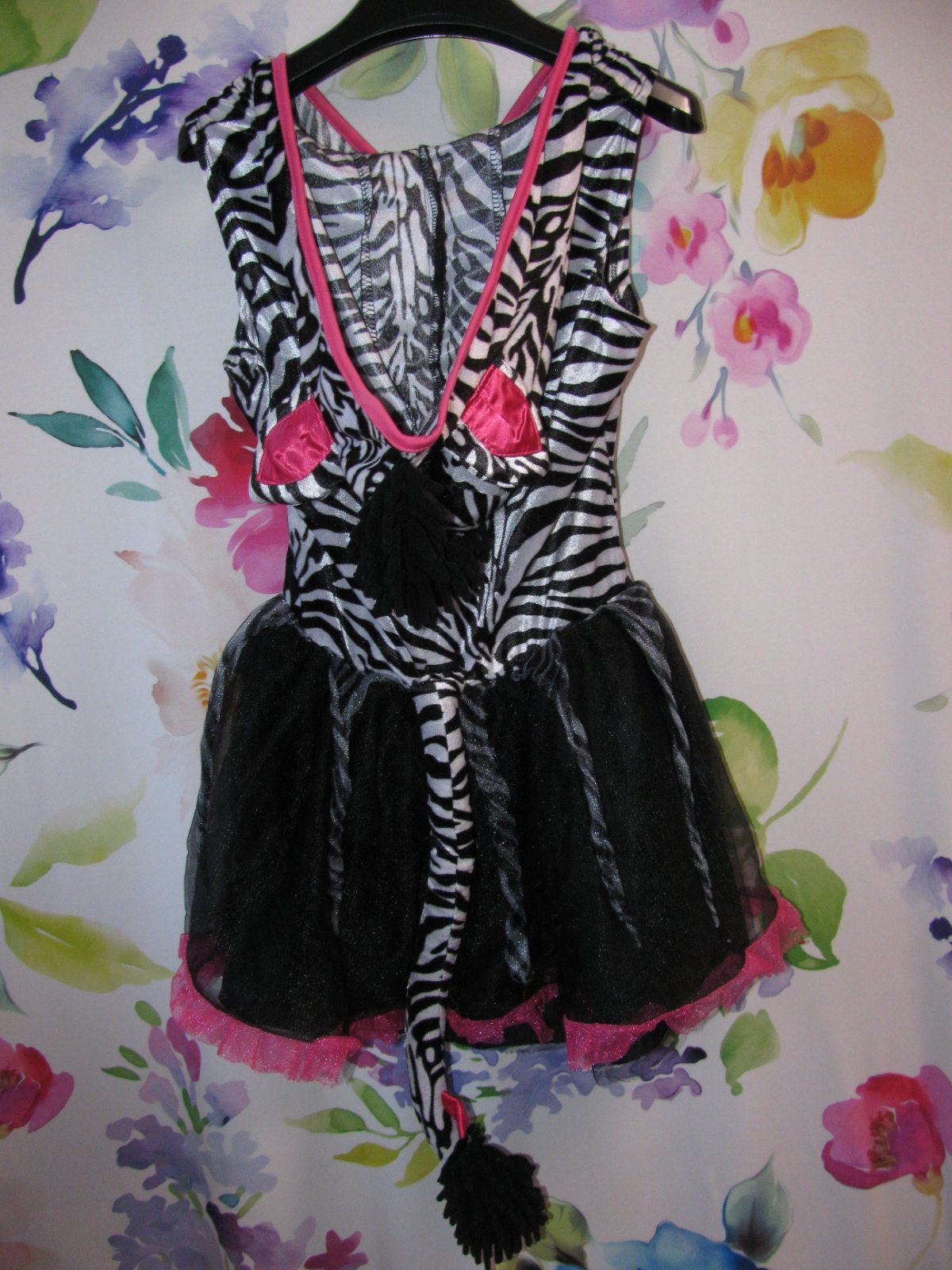 Perfektní kostým -Zebra, s ocáskem, kapucí, ve předu zip, v pase pružné do gumy, mašlička, tylová sukně s volánky, elastické bolerko. 100% polyester. Na růžovém volánku trochu roztřepený okraj, jinak Krásný stav bez jiných vad.