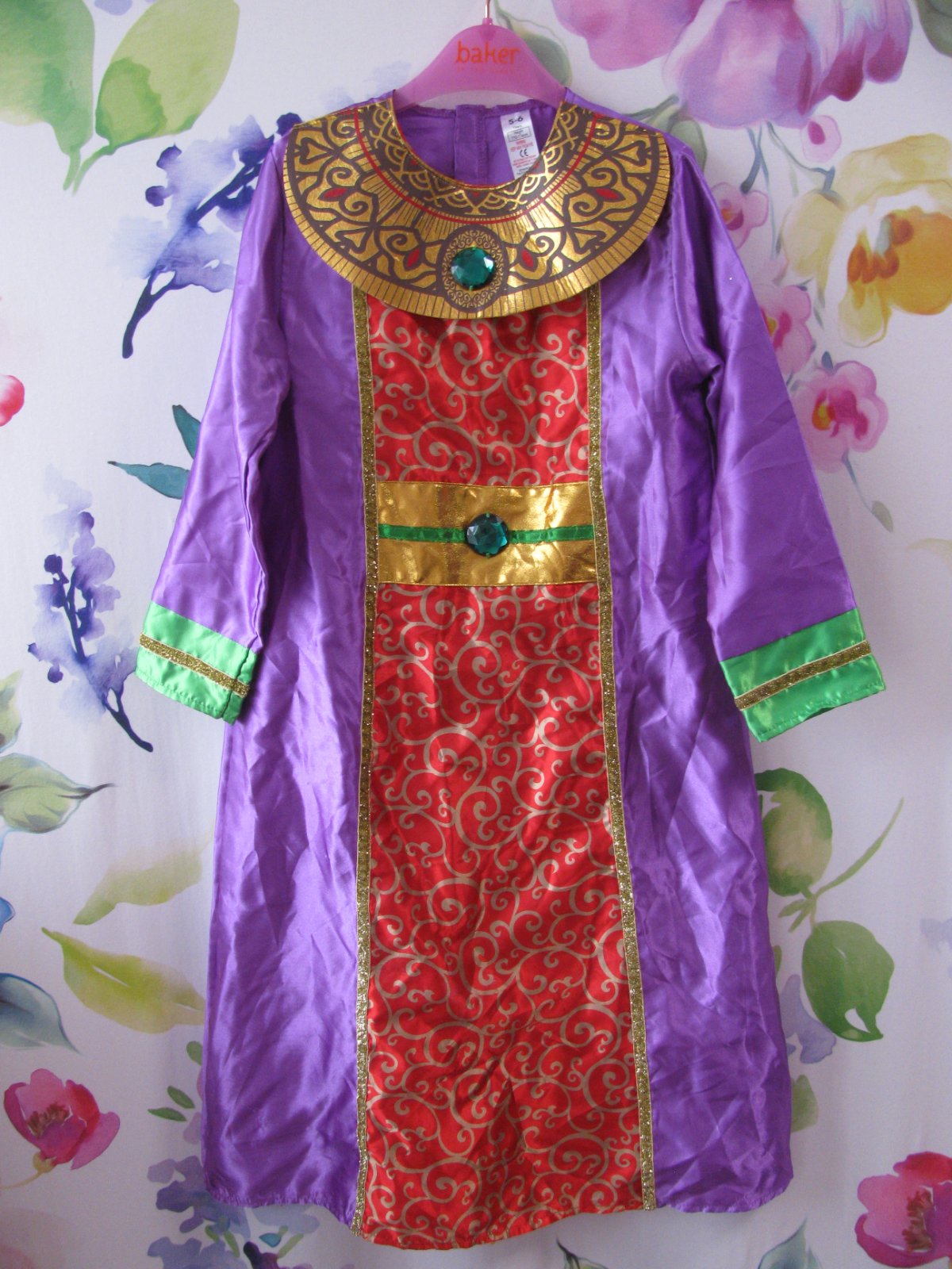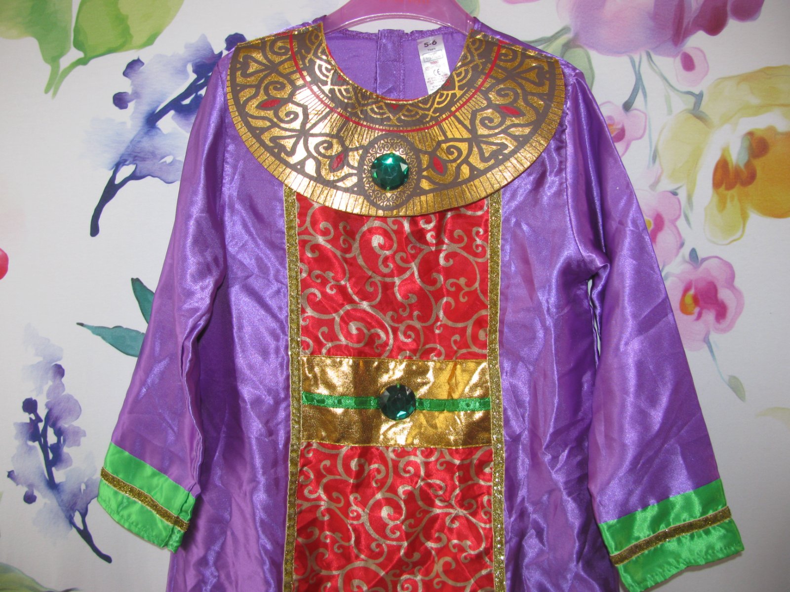 Luxusní saténový kostým, zlaté prýmky, zdobné drahokamy, za krkem zap. na suché zipy, 100% polyester.