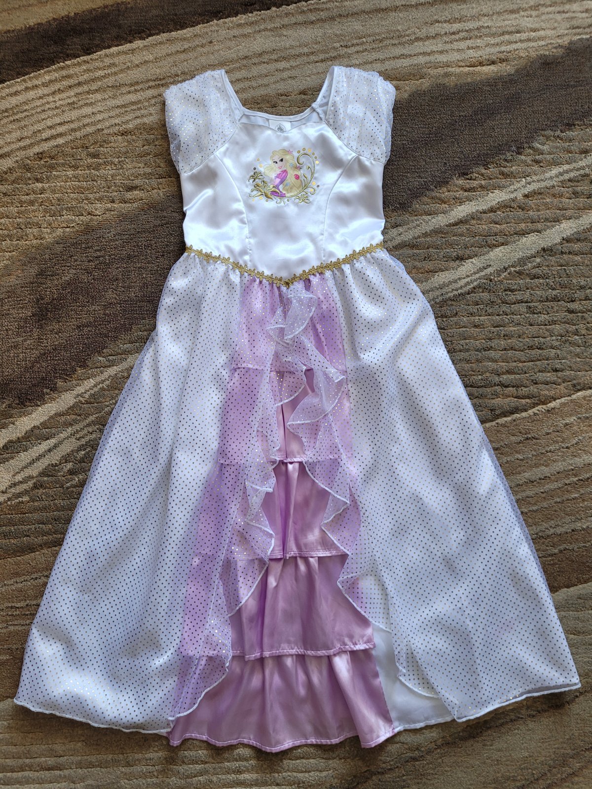 Z USA z Disney store karnevalové šaty s motivem "Na vlásku" v barevné kombinaci lila-bílé-zlaté.