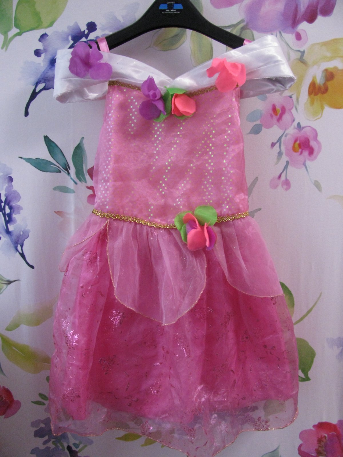 Hezké tylové růžové šaty, třpytivá malba na sukni, kytičky, flitry, zlatá prýmka, v pase pružné do gumy, 100% polyester. Lehce chloupek na zádech od suchých zipů, jinak Krásný stav bez jiných vad.