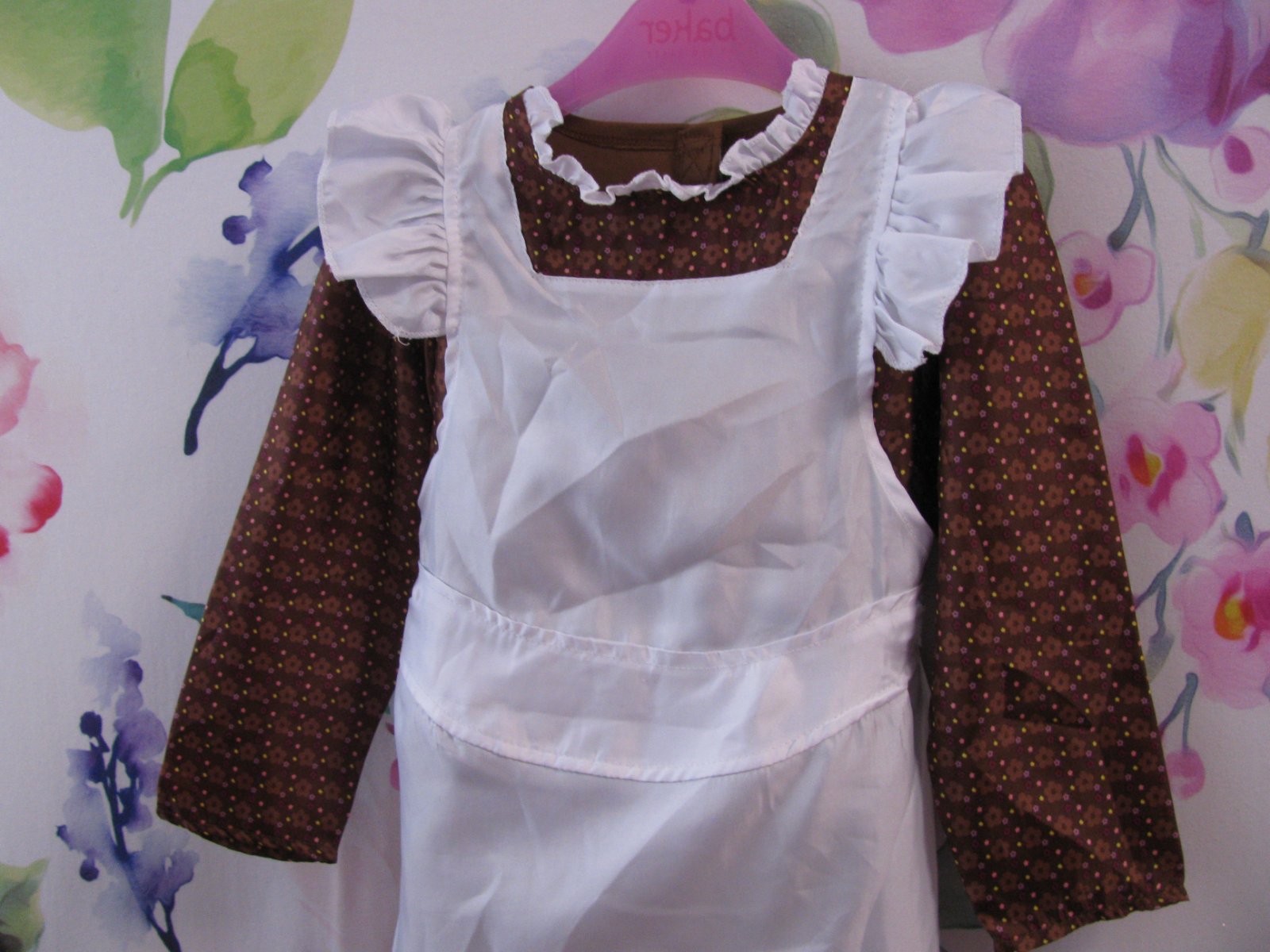 Krásné šaty s přišitou zástěrkou, v pase pružné do gumy, za krkem zap. na suché zipy, 100% polyester. Krásný stav bez vad.