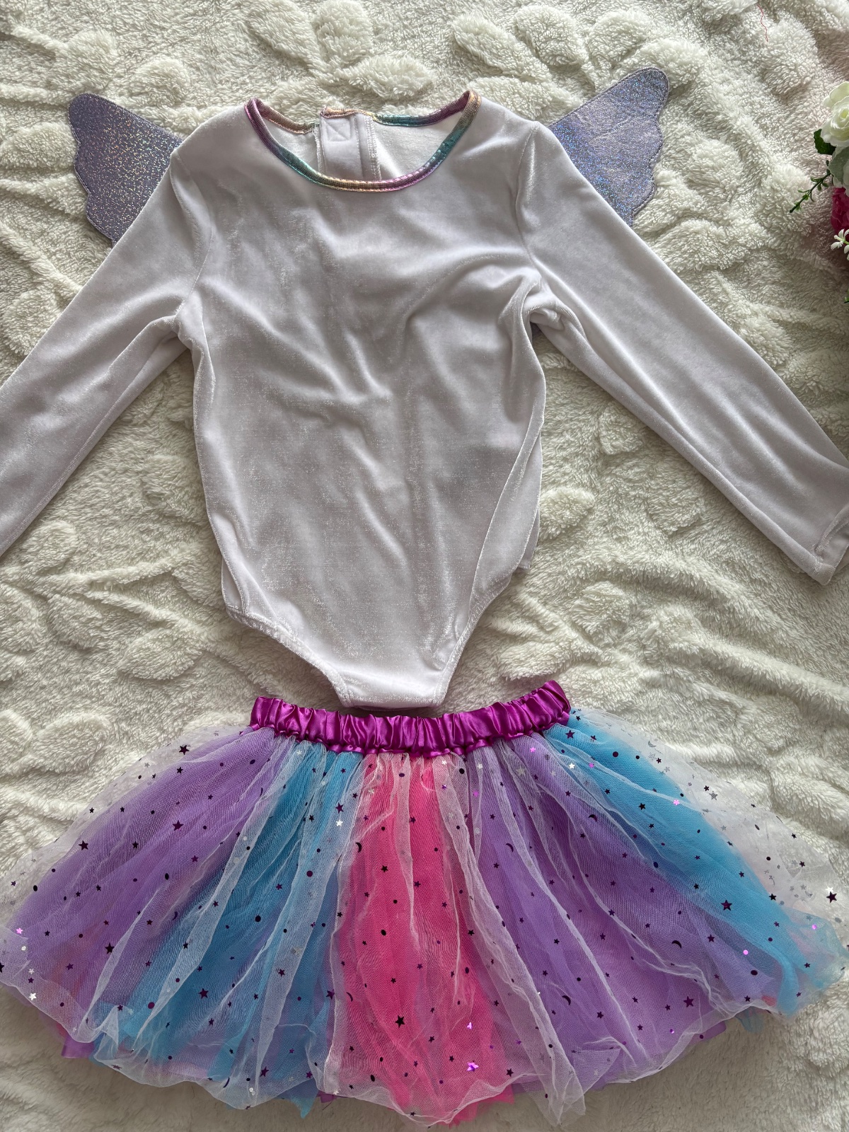 STÁLE PĚKNÝ STAV: mnou zkompletované do velikosti . Body sametové , v zadu na křídla na suché zipy . Krásná tylová sukně . Na rukávech nepatrně ušmudlané . Zohlednění v ceně.
