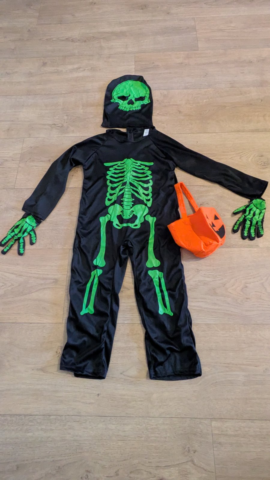 Součástí kostýmku je: overal, kukla a kabelka ve tvaru dýně - na výslužku, kostým ve tmě svítí.