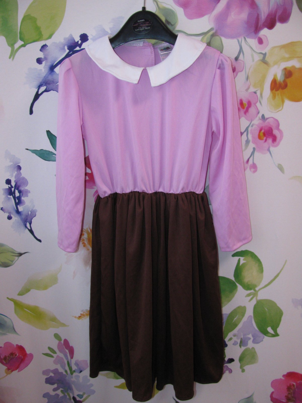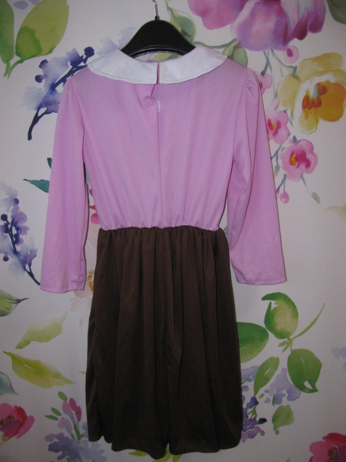 Elastické, hnědo růžové šaty, v pase pružné do gumy, za krkem zap. na suché zipy, 100% polyester. Velikost uvedená-M. Proto prosím pečlivě měřte, děkuji.