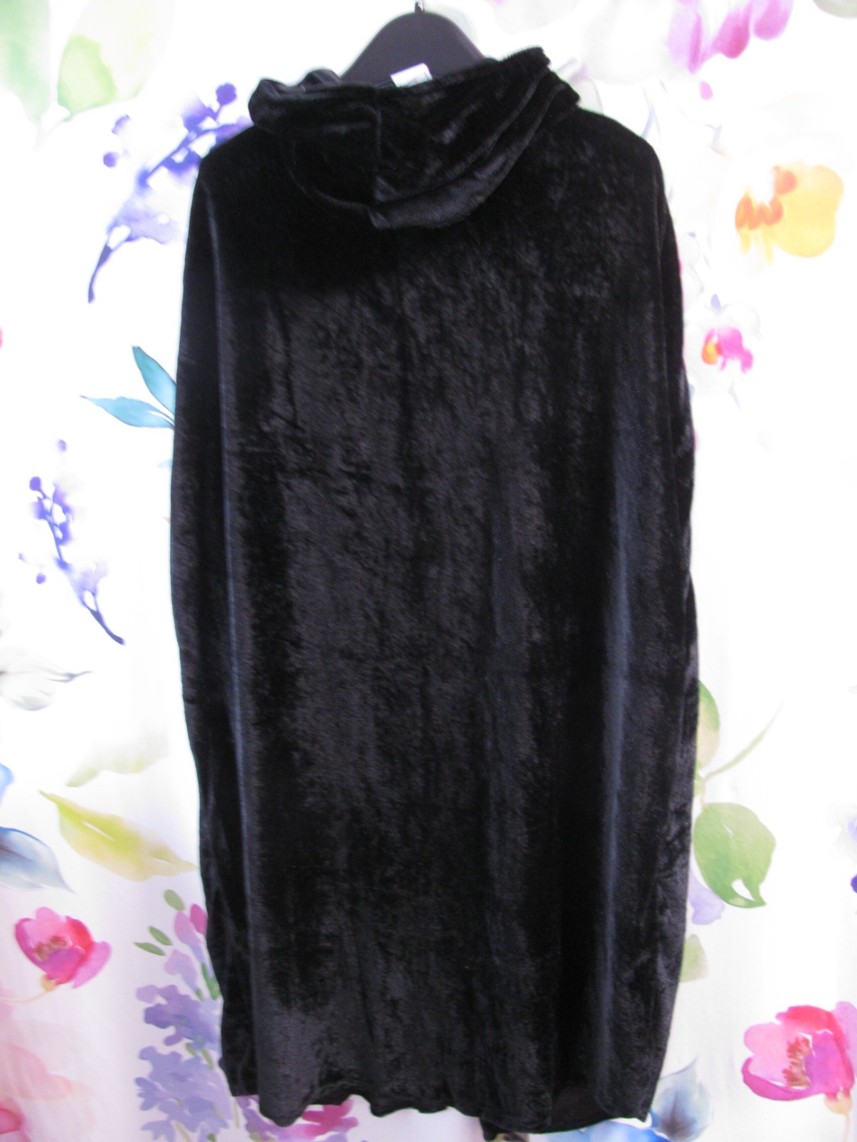 Skvělý, pružný, velurový plášť s kapucí, pod krkem zap. na suchý zip, 100% polyester. Velikost není uvedena, uvádím odhadem.