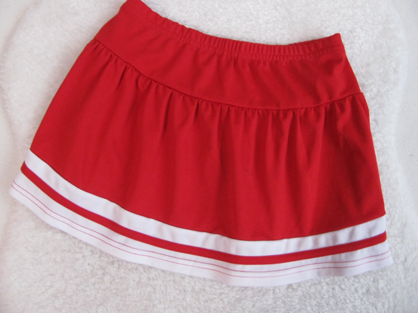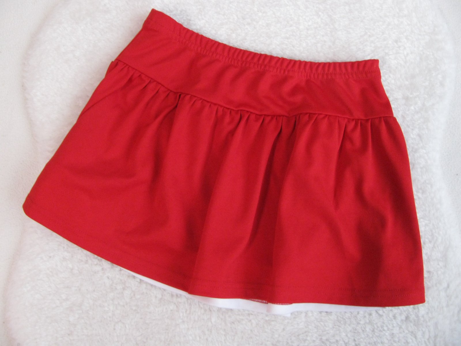 Elastická červená sukně, v pase do gumy, 100% polyester.