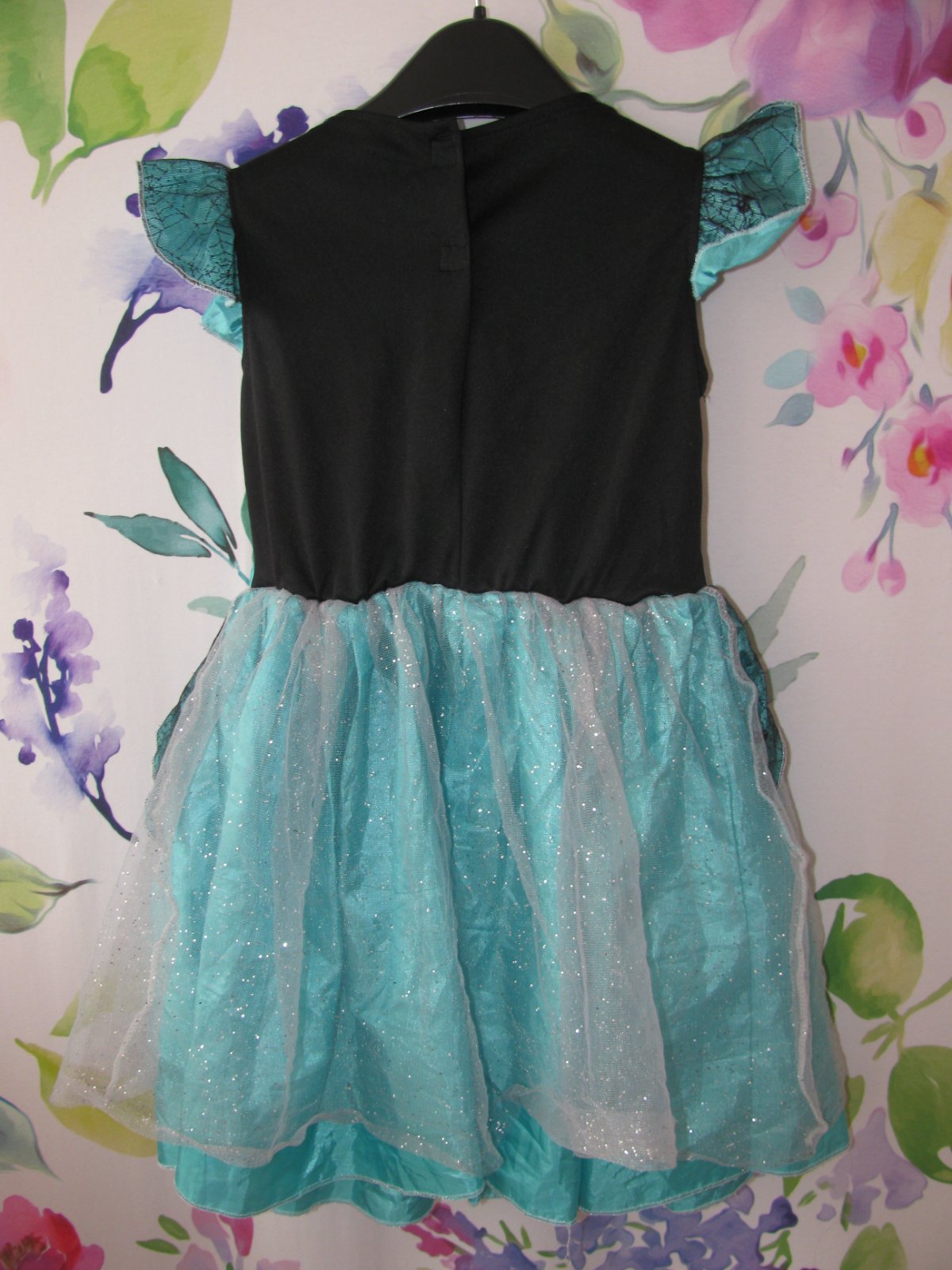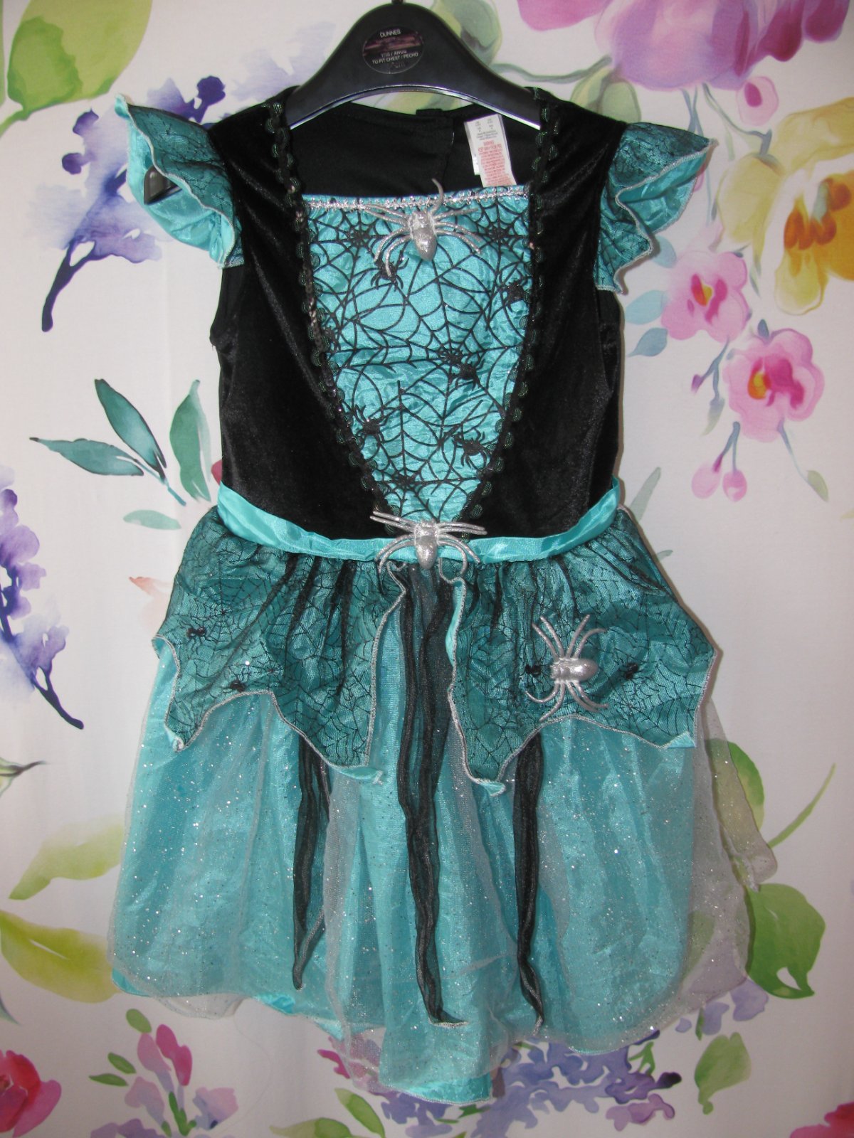 Krásné, tyrkysovo černé šaty, zdobené pavouky a pavučinkami, třpytivým tylem, prýmky, v pase pružné do gumy, elastické, velurové bolérko, za krkem zap. na suché zipy, 100% polyester. Drobná dírka na černém tylu na sukni-viz foto, jinak perfektní stav bez jiných vad.