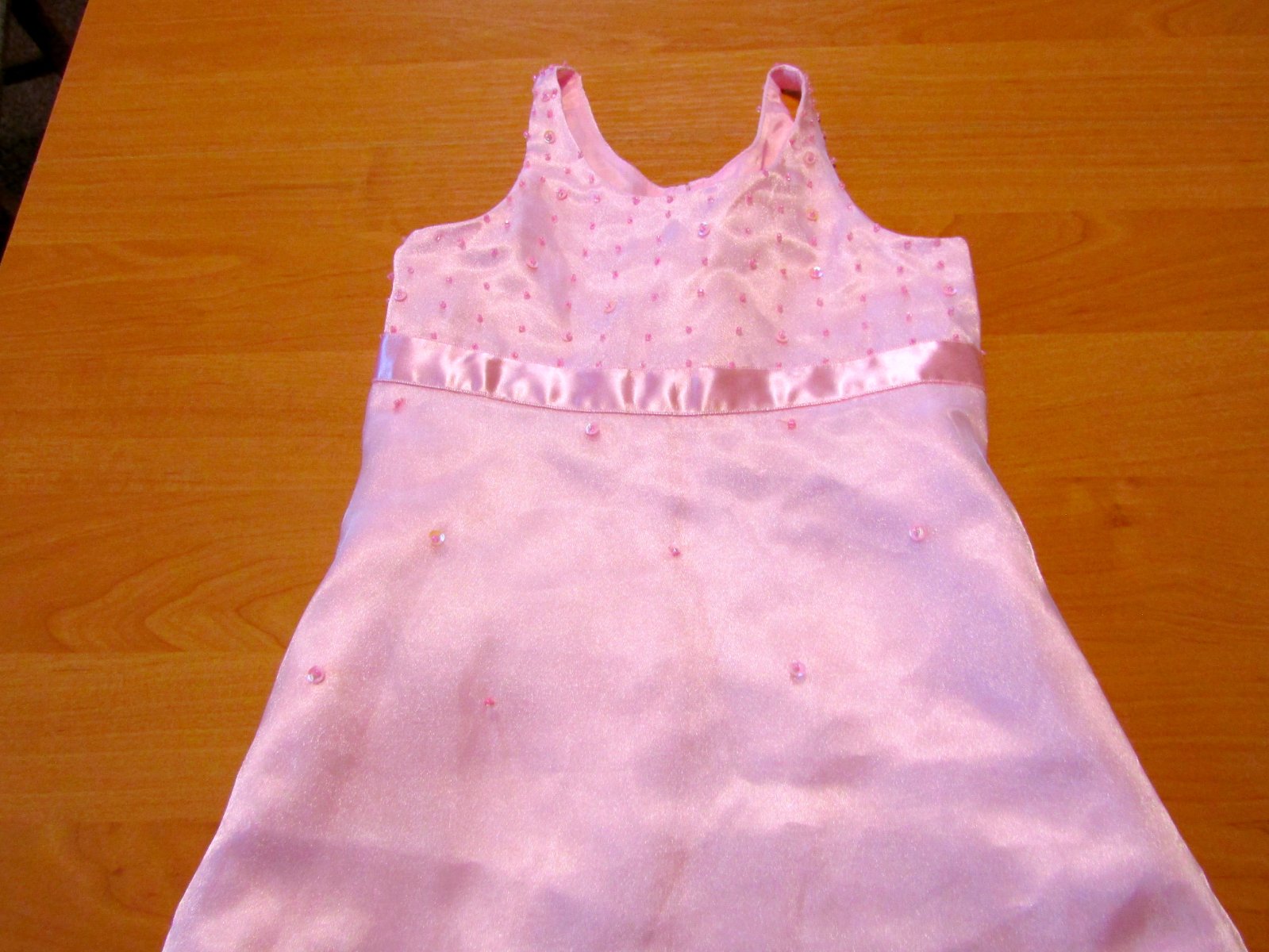 Sametové šaty s tylovou sukní, jsou v horní části z pružného sametu v barvách malinově růžové a žluté, kolem výstřihu je zdobí lem z duhových flitrů, v pase mají saténovou vázačku, sukýnka má podší...