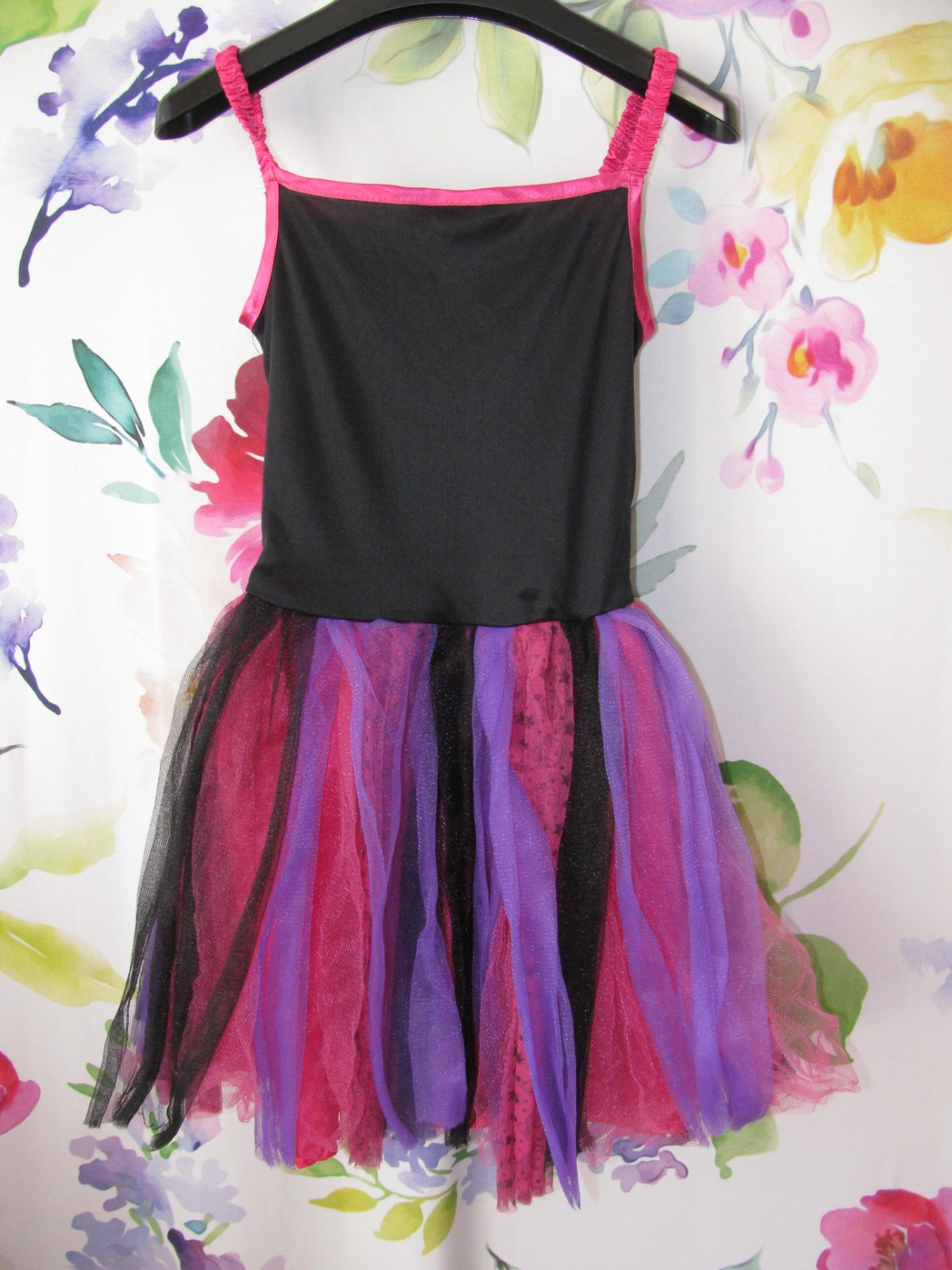 Krásné šaty na Halloween, bohatě zdobené , prvky dýně, třpytivý obrázek , elastické velurové bolérko, v pase pružné, 100% polyester. Zašitá menší dírka na tylu, není to vidět v řasení, přesto upozorňuji pro pořádek. Jinak krásný stav bez jiných vad.