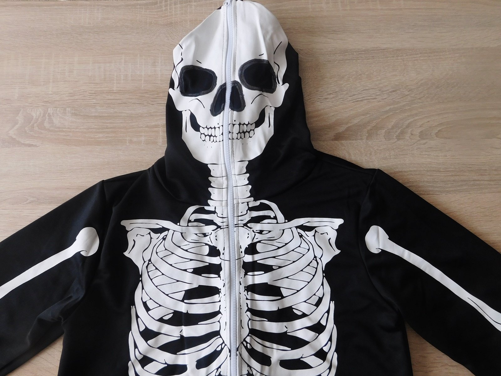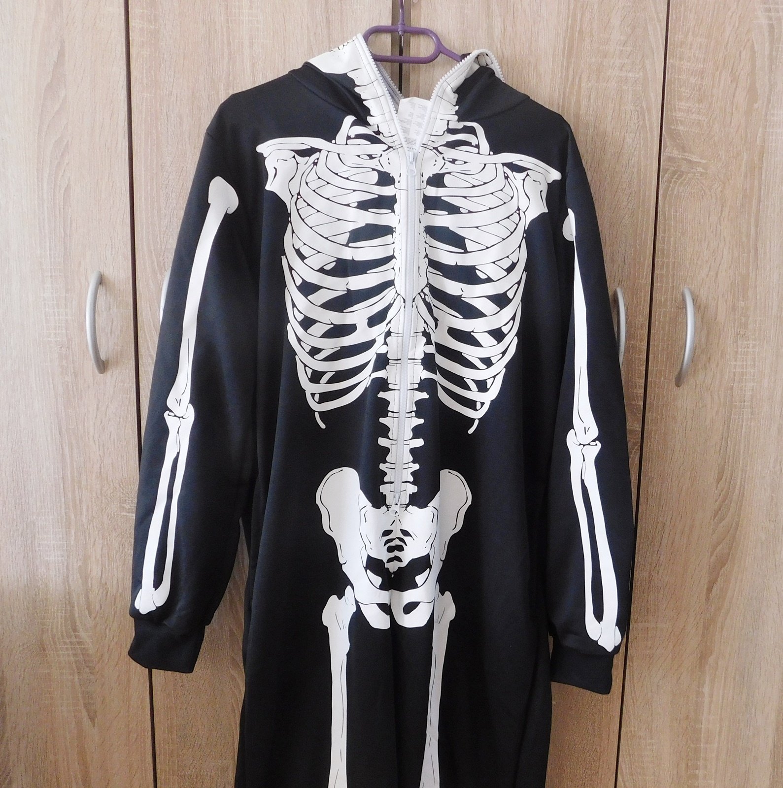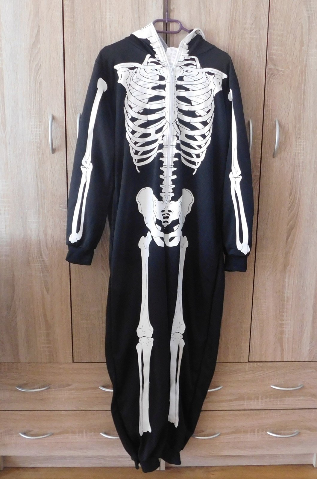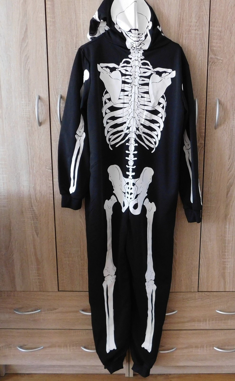 vel.psaná S,ale je S/M,unisex.Síťové otvory na oči a nos,má kapsy.Není to tenký materiál.Je na zip.Délka kostýmu 140cm,noh.75cm,ruk.od krku 70cm,š.2x50cm