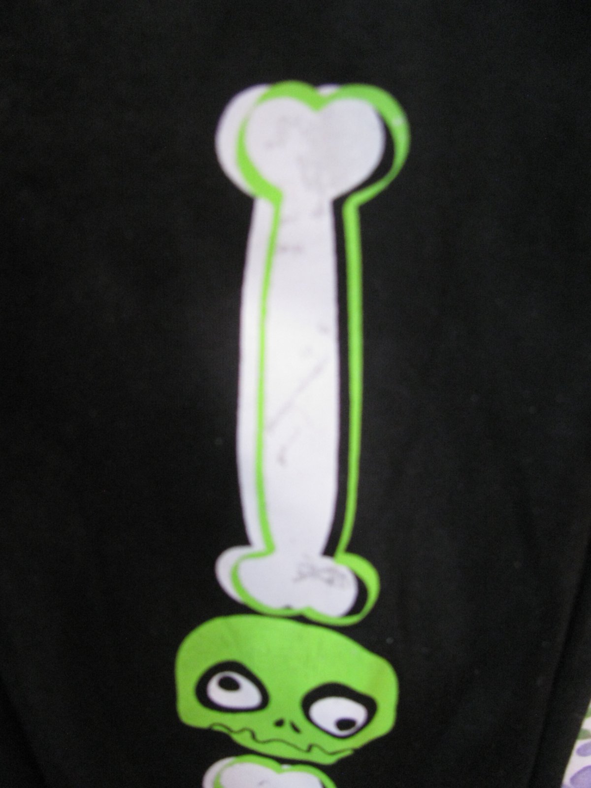 Elastický černý kostým, overal, za krkem zap.na suché zipy, 100% polyester. Na hrudi na bílých kostech byla stříbrná barva, ta je zčásti už setřená, proto ty flíčky na foto, raději upozorňuji pro pořádek, jinak bez dalších vad. Zohledněno v ceně.