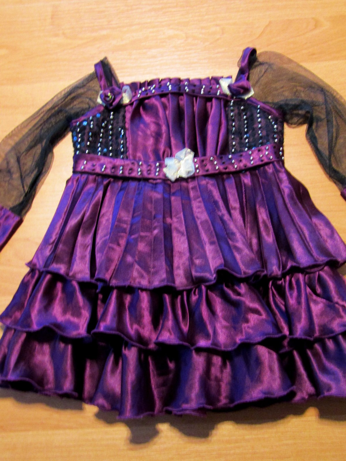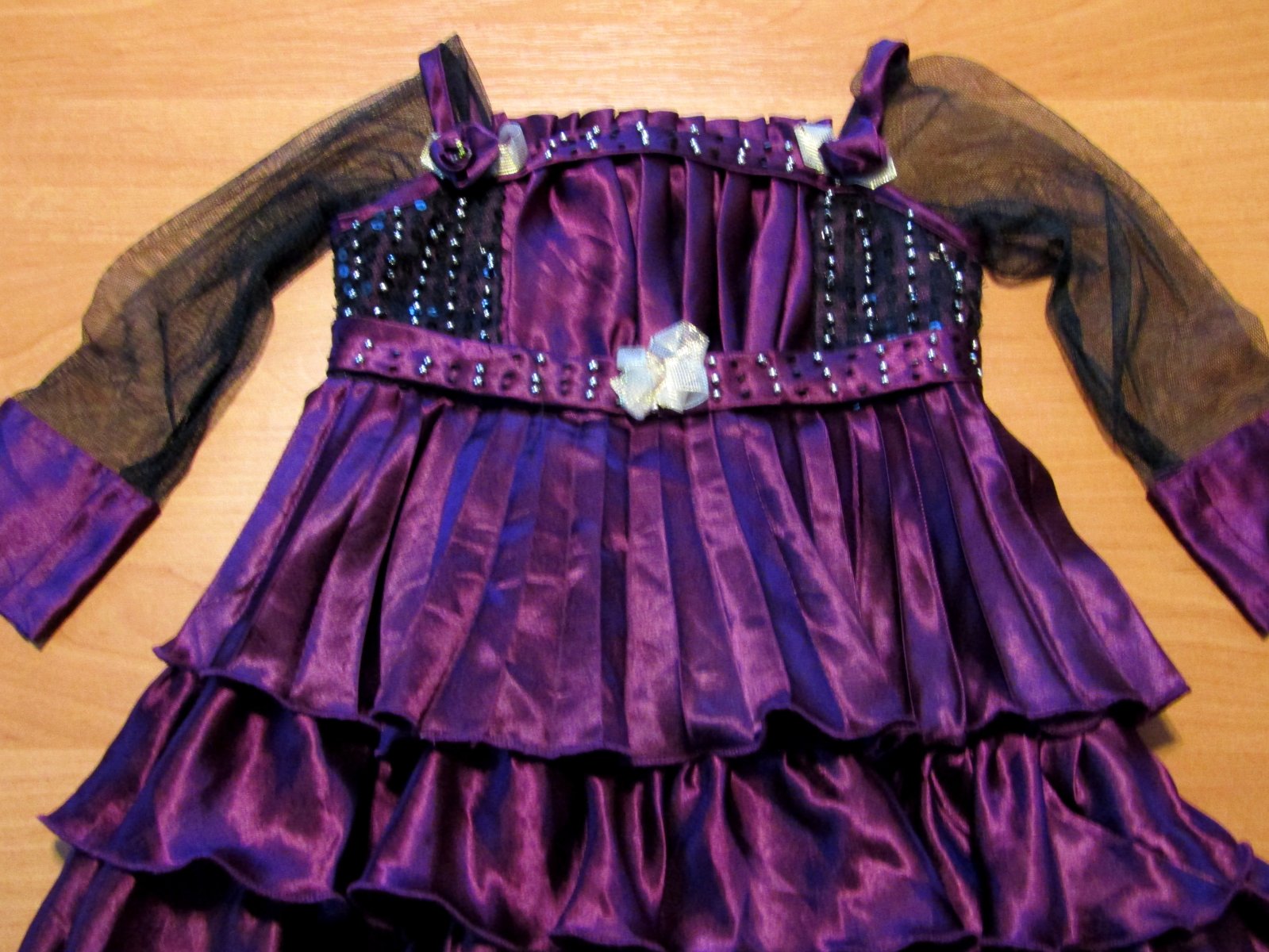 Šatičky na 5-6 let,na zádech kolem suchého zipu pár žmolků,na tmavé látce není skoro vidět.Vepředu byla asi ozdoba,ta je utržená,jsou tam 2 dírky, půjdou zašít.
