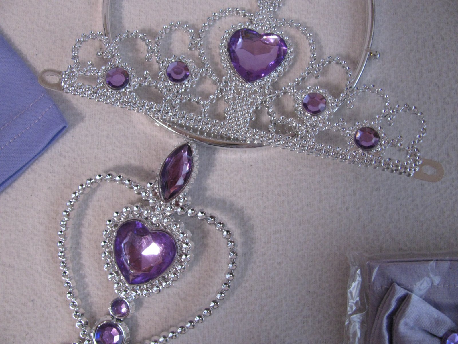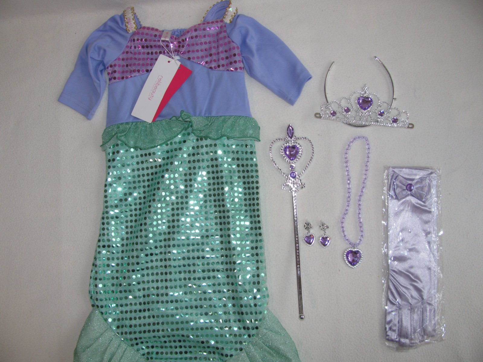 Krásný 6 dílný kostým, který obsahuje šaty, korunku, hůlku, náhrdelník, náušnice a rukavice. Kostým je elastický, zdobený flitry, třpytivým tylem, pružné bolerko s rukávy, 100% polyester. Vhodné jako dárek.