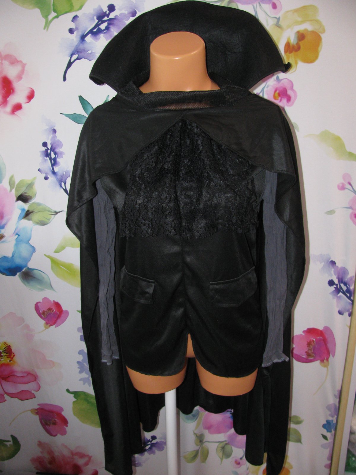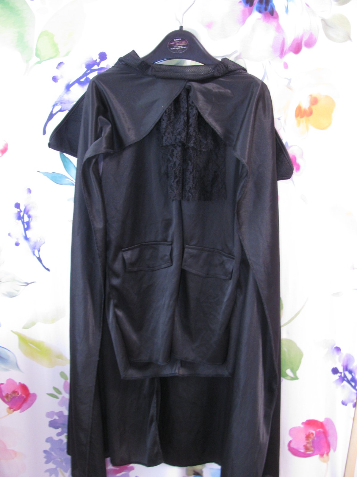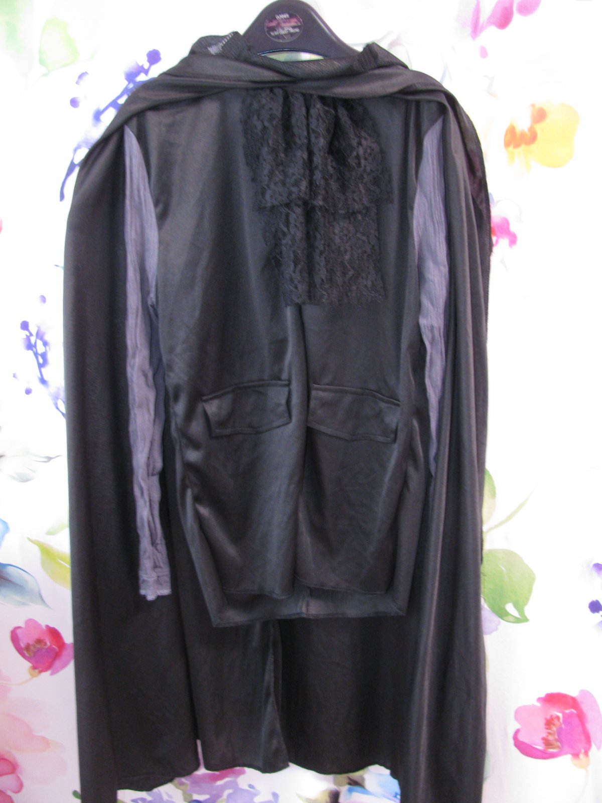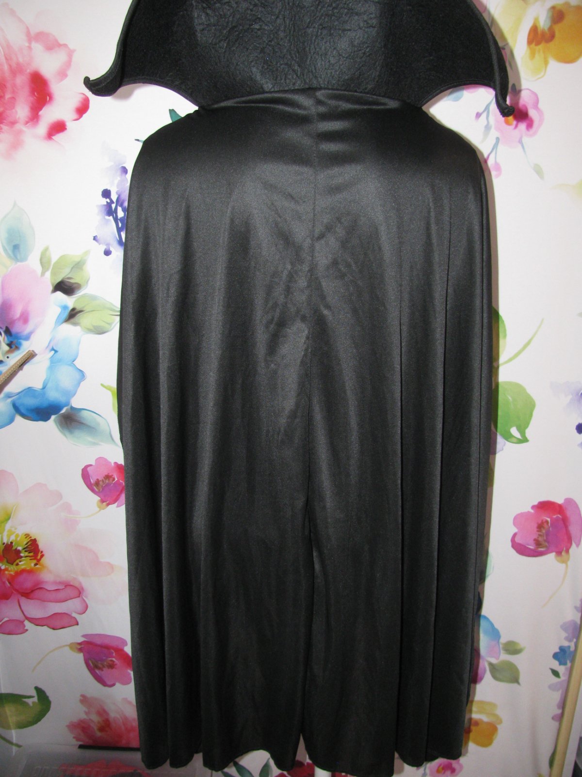 Kostým upíra nebo hraběte Drákuly v černé barvě, který obsahuje dlouhý plášť s vysokým límcem a halenu s dlouhým rukávem, často se používá na Halloween či karnevaly. 100% polyester. Top stav bez vady.