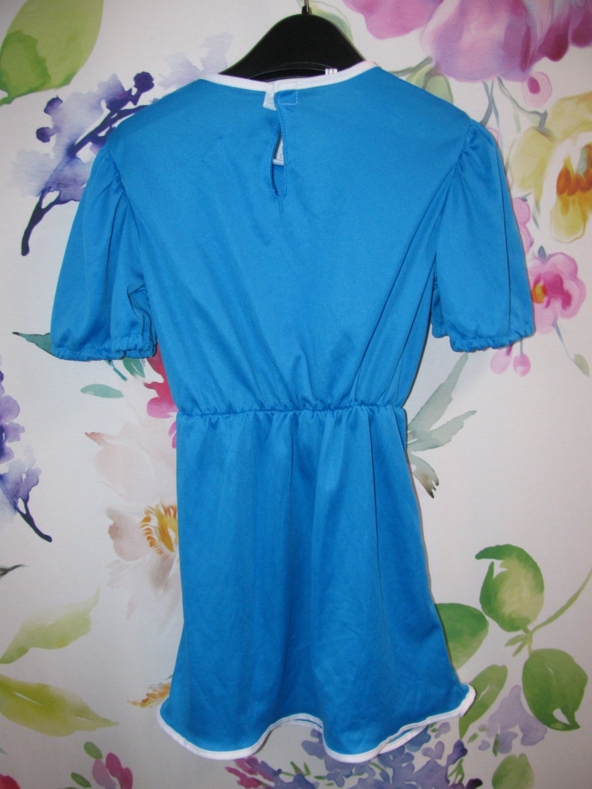 Modré, elastické šaty s všitou zástěrkou, v pase pružné do gumy., za krkem zap. na suchý zip, 100% polyester. Gumičky jsou na koncích rukávů trochu vytahané, -upozorňuji pro pořádek, zohledněno v ceně. Jinak jsou šaty plně nositelné. Velikost uvádím dle rozměrů, není uvedena.