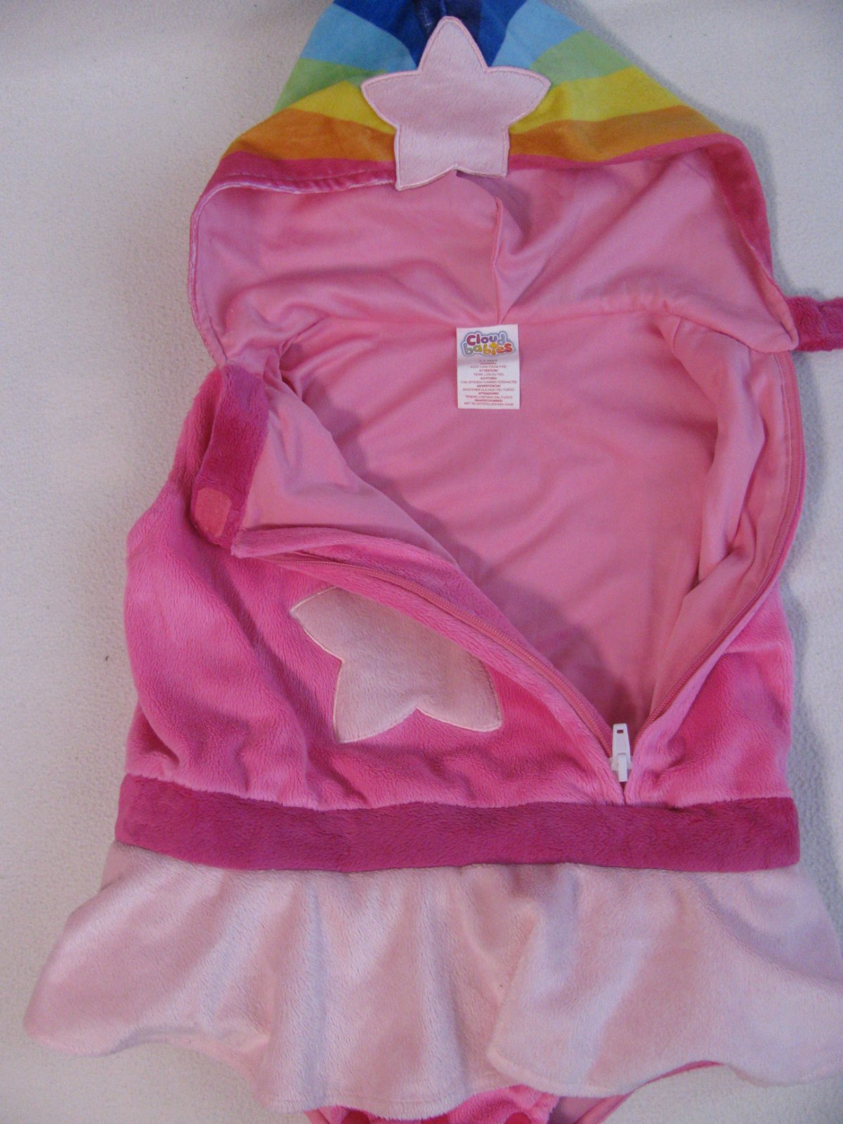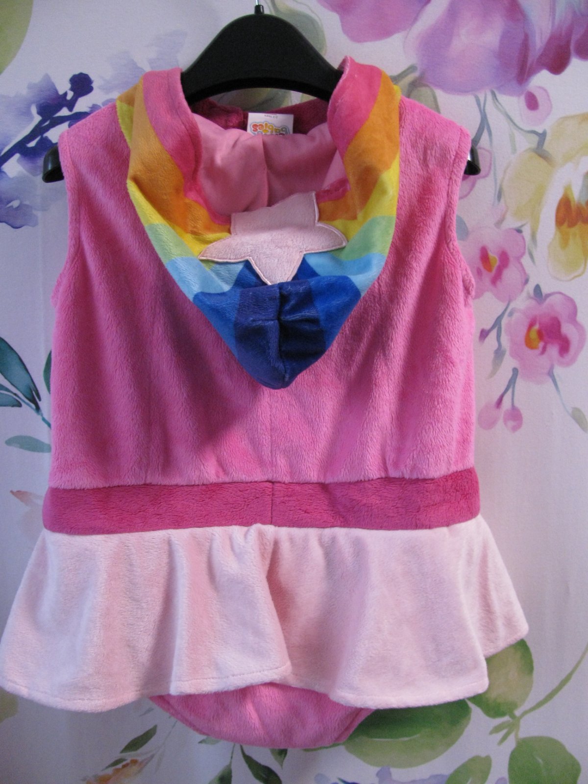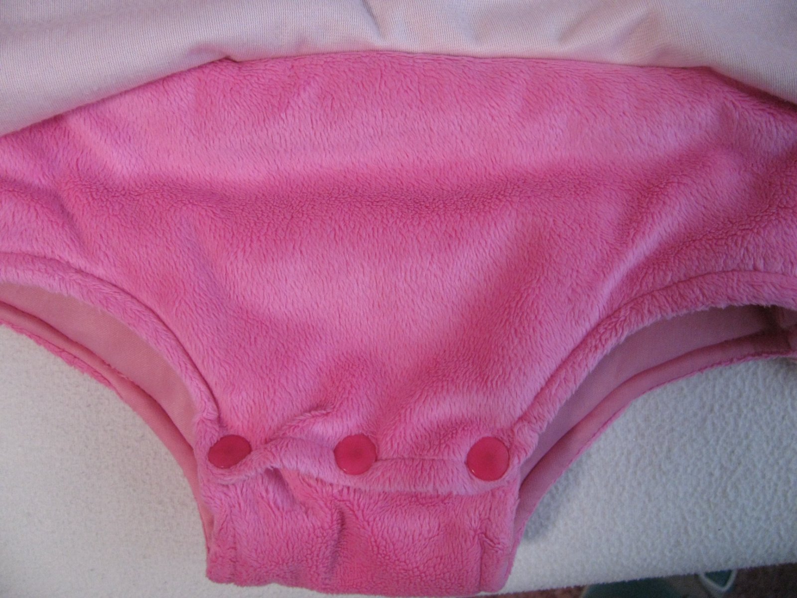 Jemný sametový růžový kostým s kapucí, mezi nožkama na patentky, na hrudi zip, pod krkem suchý zip, 100% polyester. Top stav bez vady.