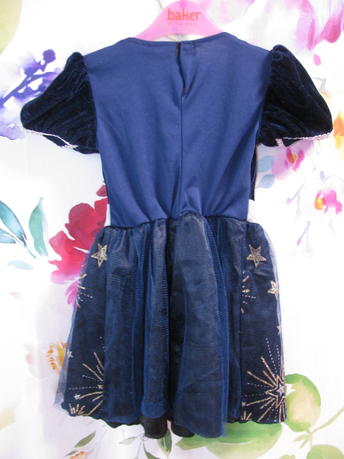 Krásné, sametové tmavě modré šaty, tylová sukně nádherně zdobená noční oblohou, stříbrnou prýmkou, v pase pružné, elastické bolerko, za krkem zap. na suchý zip. 100% polyester. Top stav bez vady.