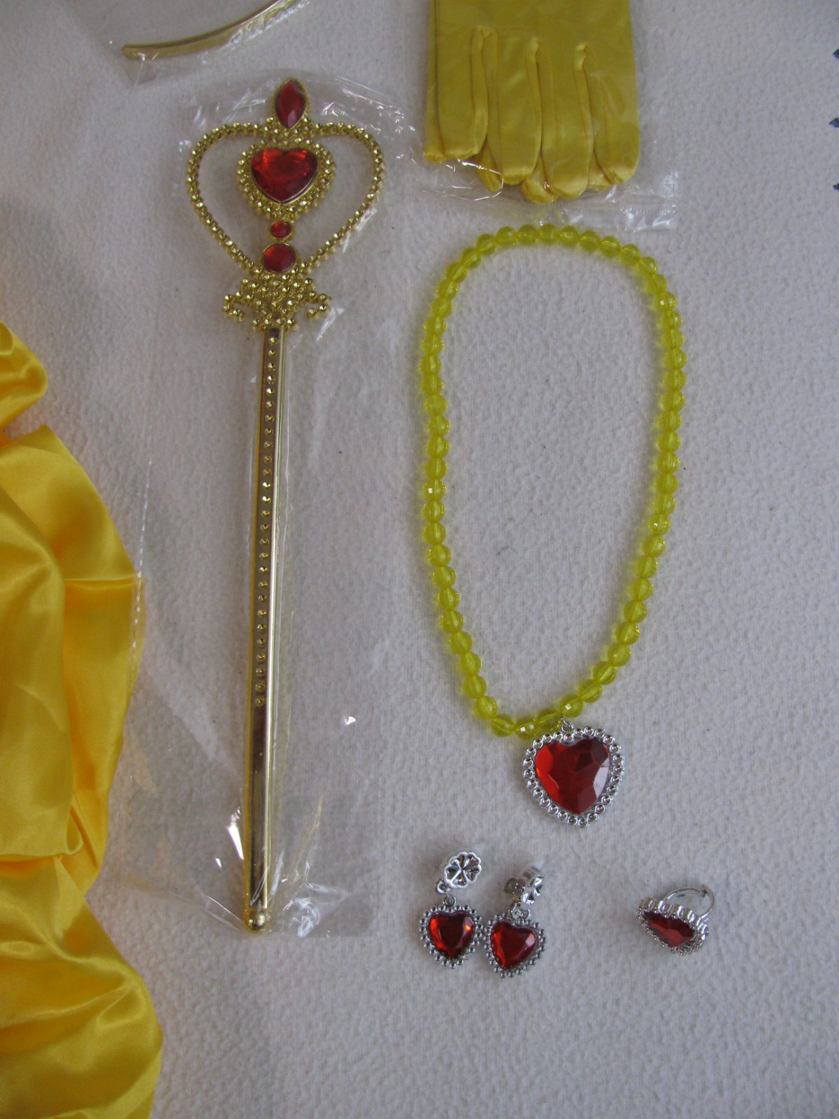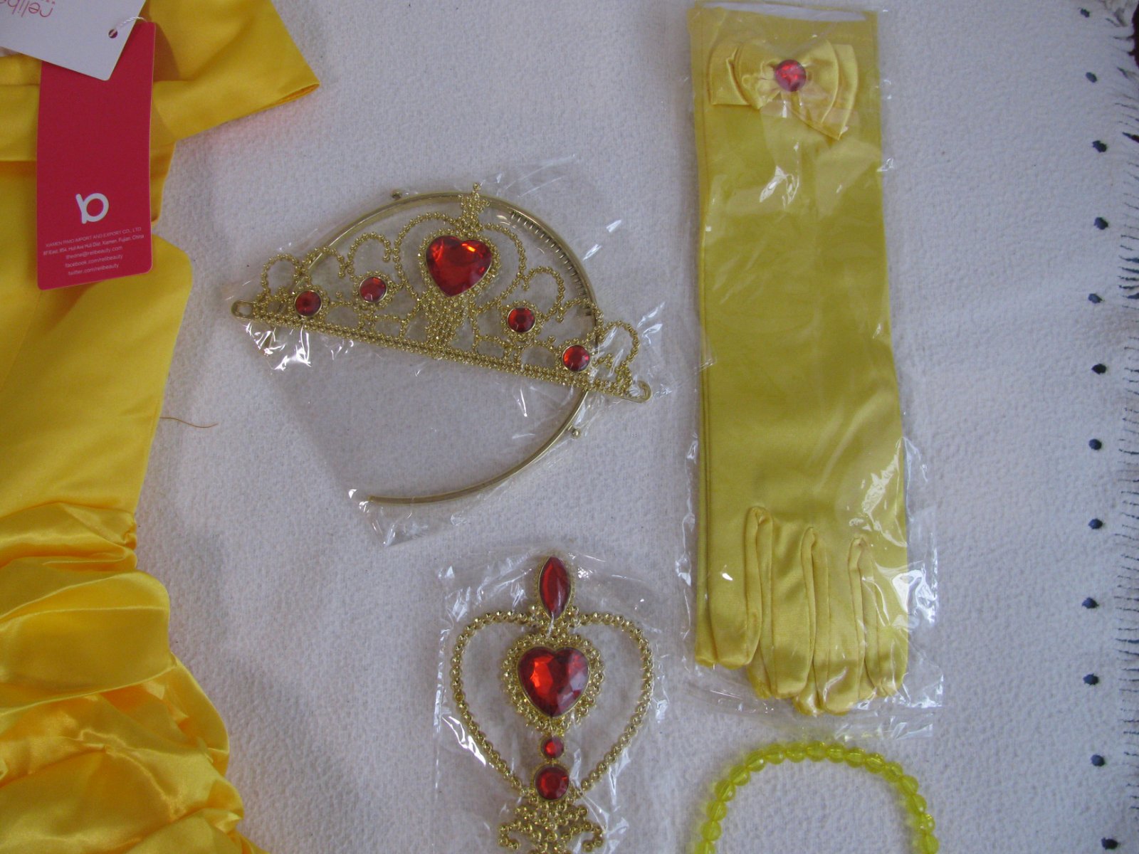 Nádherné saténové šaty, pružné řasení, pružné ramínka, na zádech zip, v pase nejsou pružné, 100% polyester. K šatům je korunka, hůlka, rukavičky, náhrdelník, prsten, náušnice.