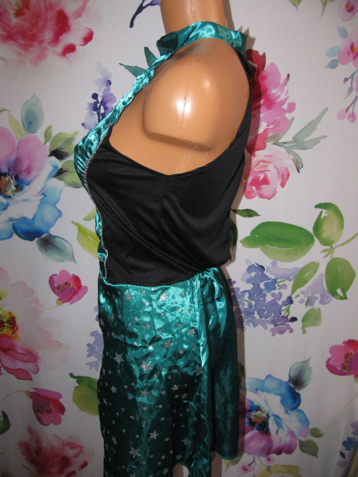 Krásné saténové šaty, s potiskem stříbrných hvězdiček, v pase pružné, za krkem zap. na suché zipy, pružné černé bolérko, bez rukávů, 100% polyester. Top stav bez vady. Velikost na štítku-S/M.
