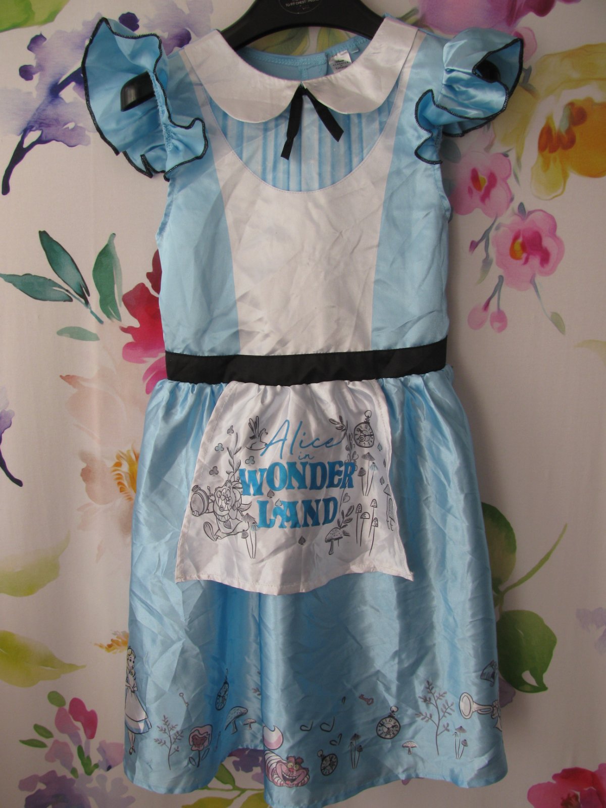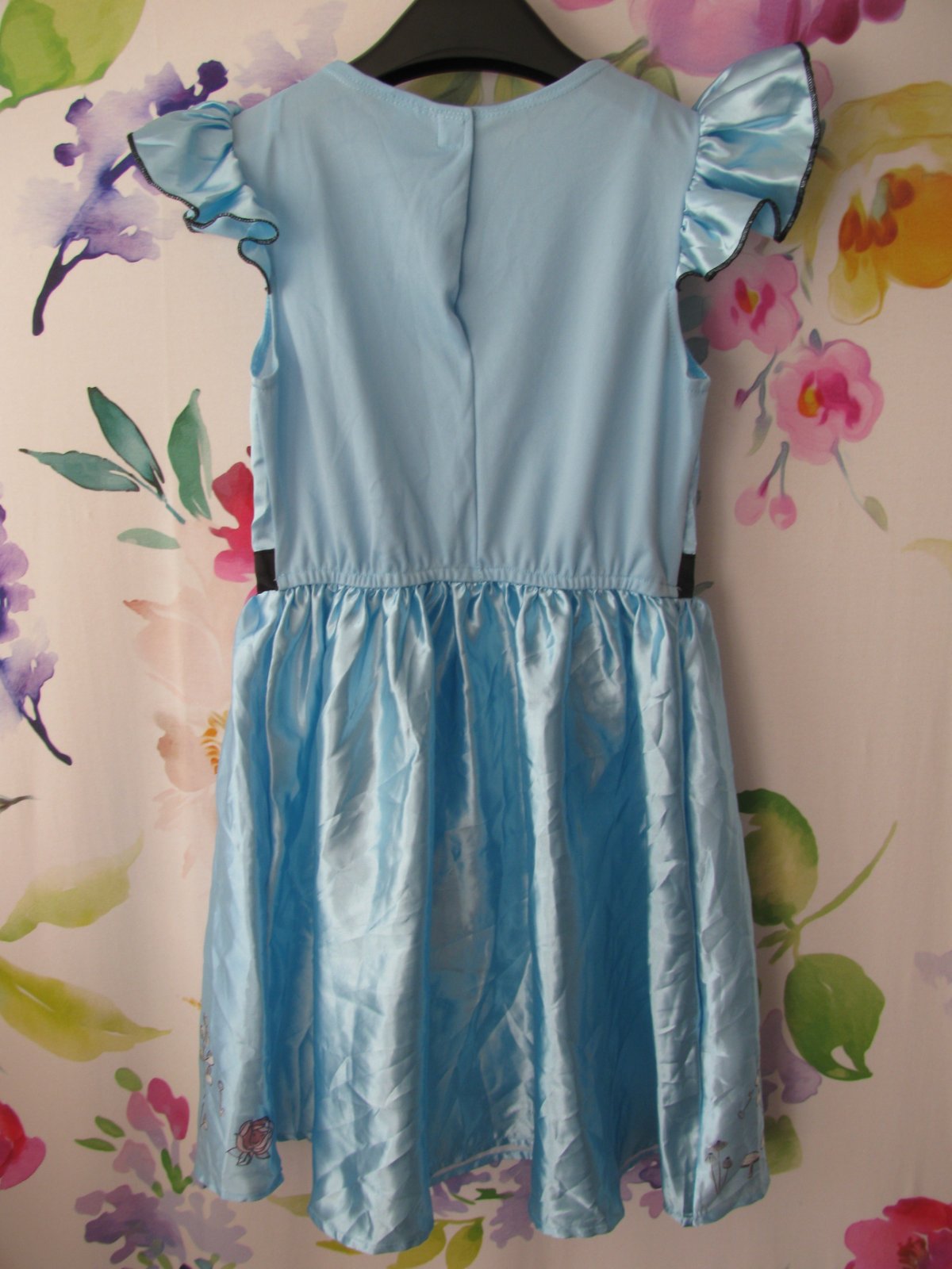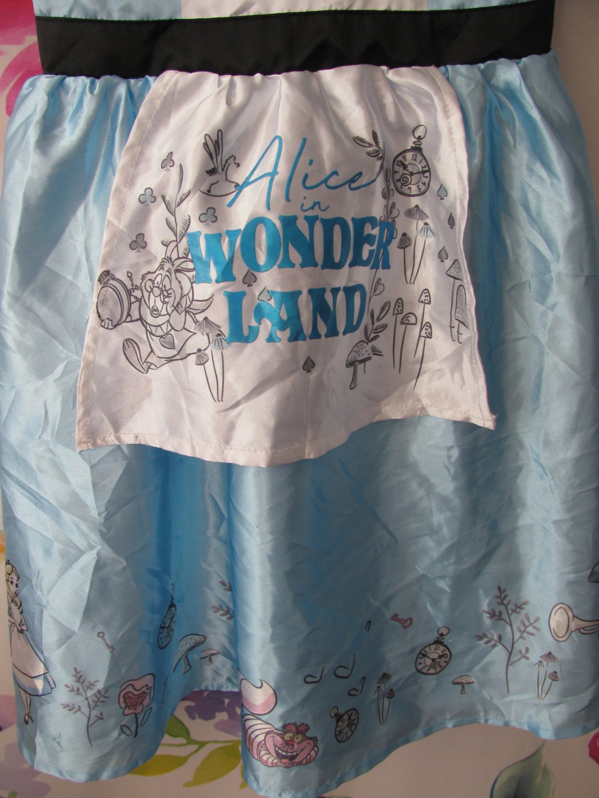 Krásné saténové šaty, se zástěrkou, krásnými obrázky, v pase pružné do gumy, zap. za krkem na suché zipy, 100% polyester.