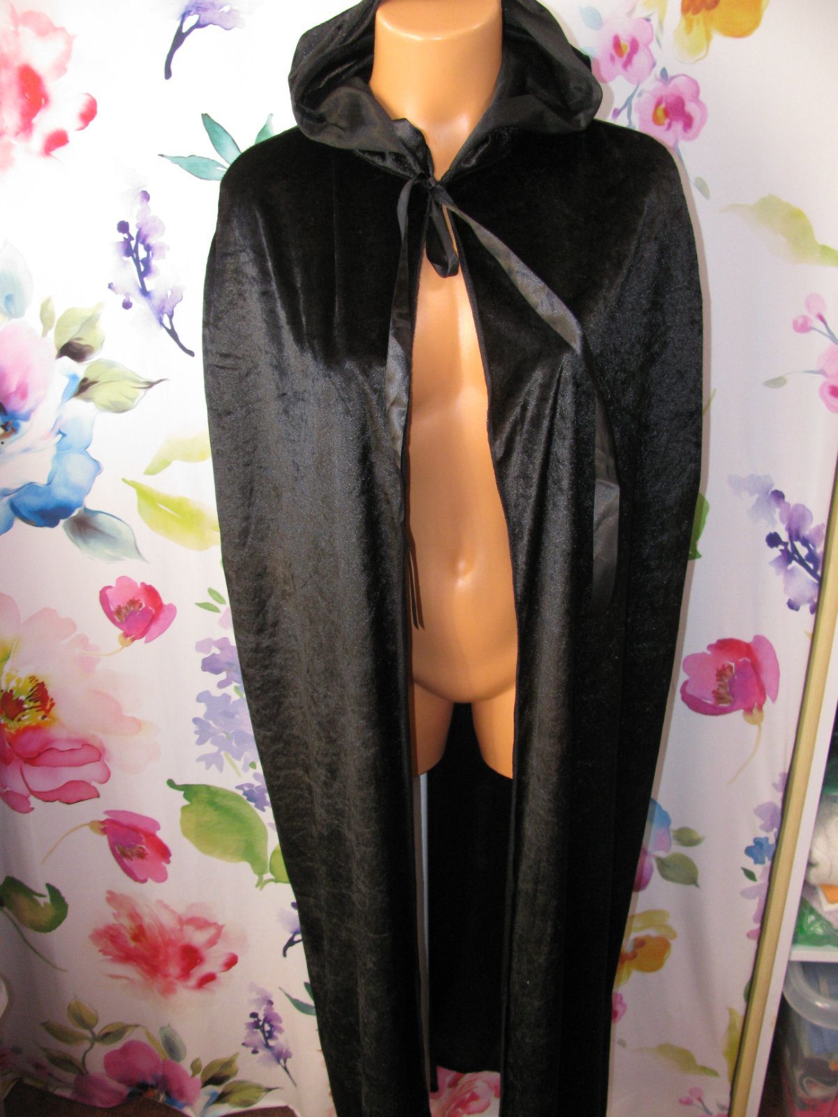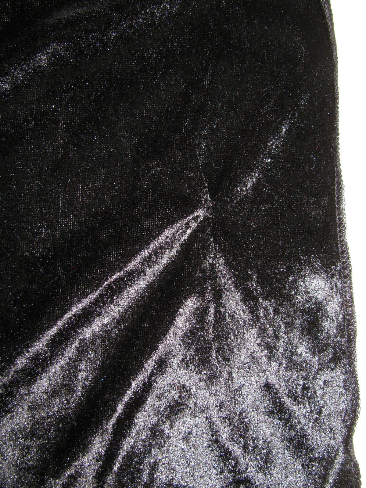 Elastický velurový černý plášť s kapucí, pod krkem na zavazování, 100% polyester. Dole u lemu zašitá dírka-viz foto, upozorňuji pro pořádek, jinak bez vady , krásný stav. Velikost není uvedena, uvádím dle rozměrů.