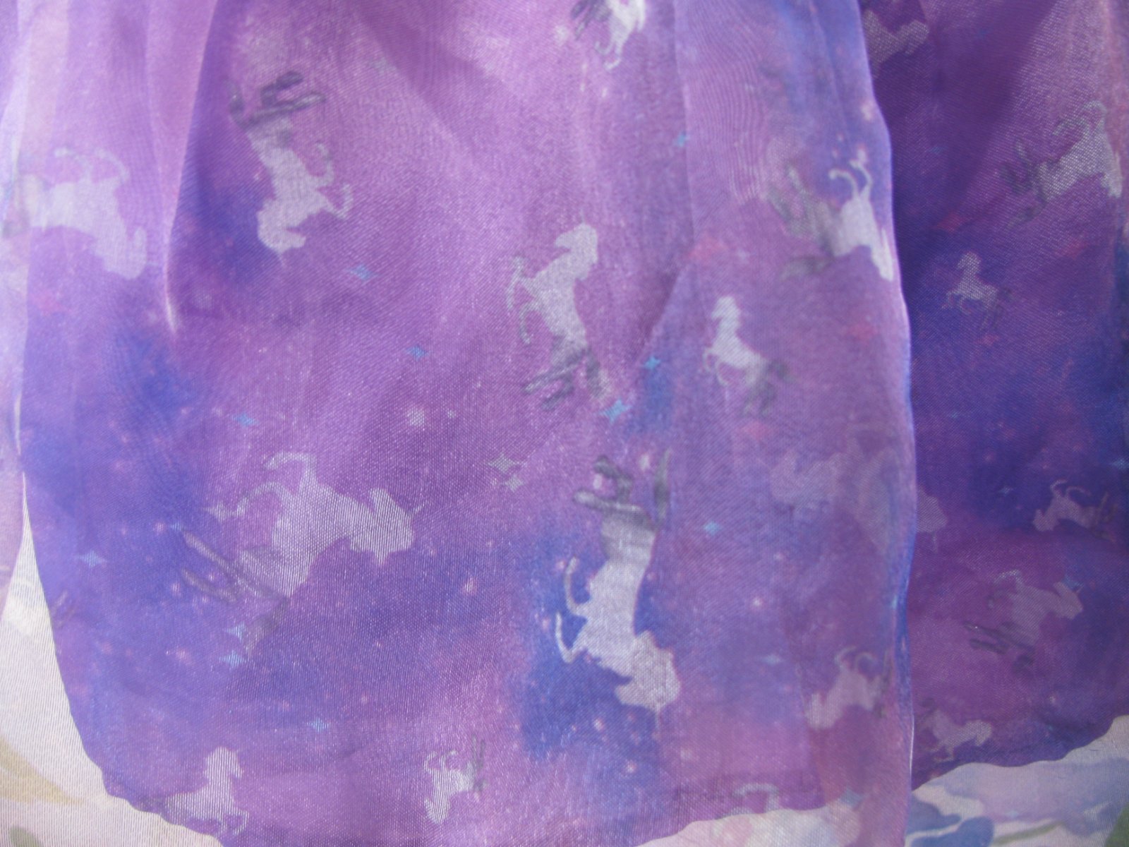 Krásné fialové tylové šaty, s celoplošným obrázky jednorožce, na hrudi flitry s jednorožcem, v pase pružné do gumy.100% polyester. Top stav bez vady, snad i nenošené.