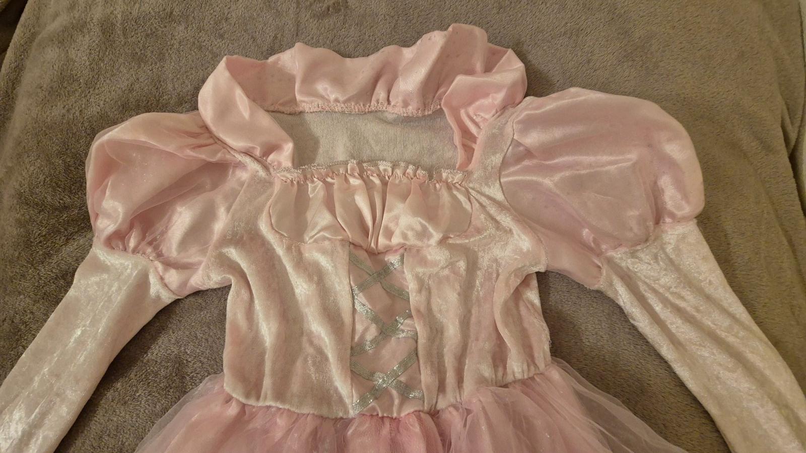 Velikost odhaduji 122, celková délka šatů je 90 cm. Spodni lem maji lehce poškozený od nošení, někde se najde i malá dirka, zohledněno v ceně.
