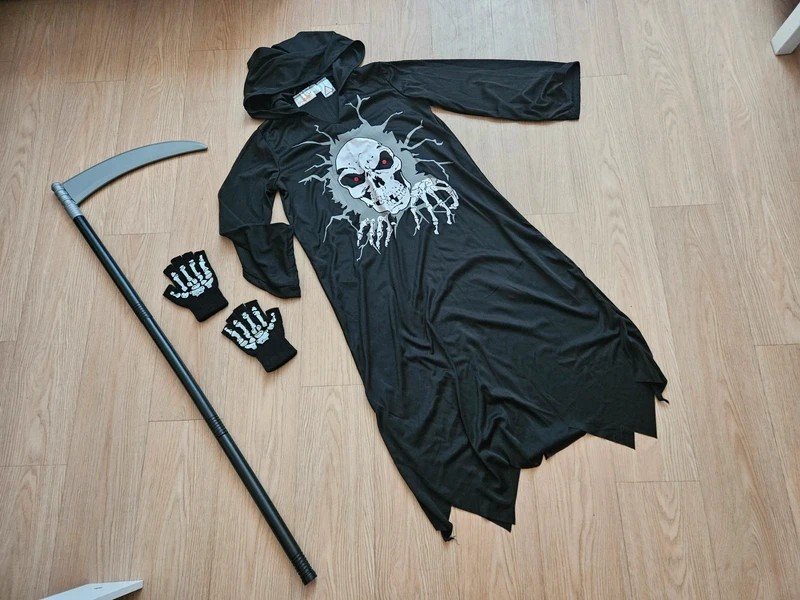 Kostým kostlivce, je skvělý, měl velký úspěch, 2x na sobě, obsahuje plášť s kapucí, bezprsté teplé rukavice a skládací kosu, fotka pro představu jak syn vypadal, prodej bez masky
