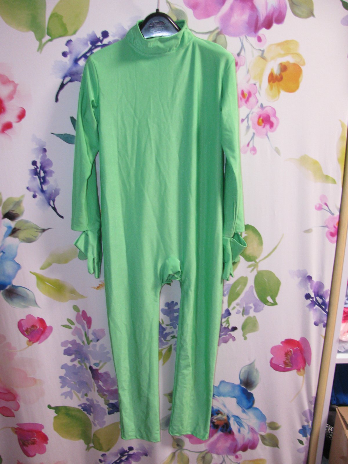 Krásný zelený elastický overal, mezi nohama otvor na suchý zip, na zádech dlouhý zip, rukávy dlouhé až přes dlaně a prsty, 100% polyester. Velikostní štítek není, proto prosím pečlivě měřte, děkuji.