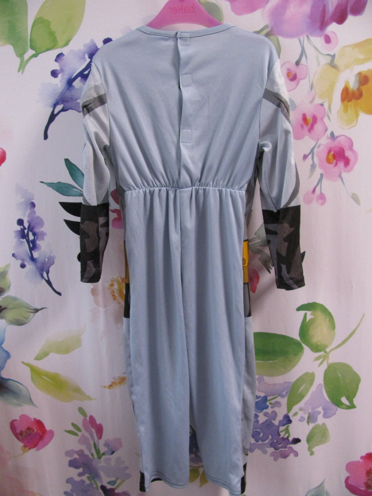 Hezký, světle šedý kostým, hruď a rukávy vypolstrovány, na prsou znak, v pase pružné do gumy, za krkem zap. na suché zipy, 100% polyester. Zlatá barva na znaku je mírně setřená - viz foto, jinak bez vady, velmi hezký stav.