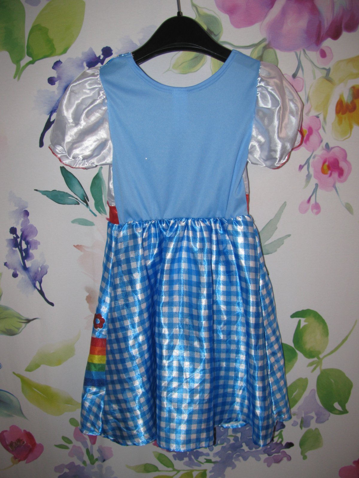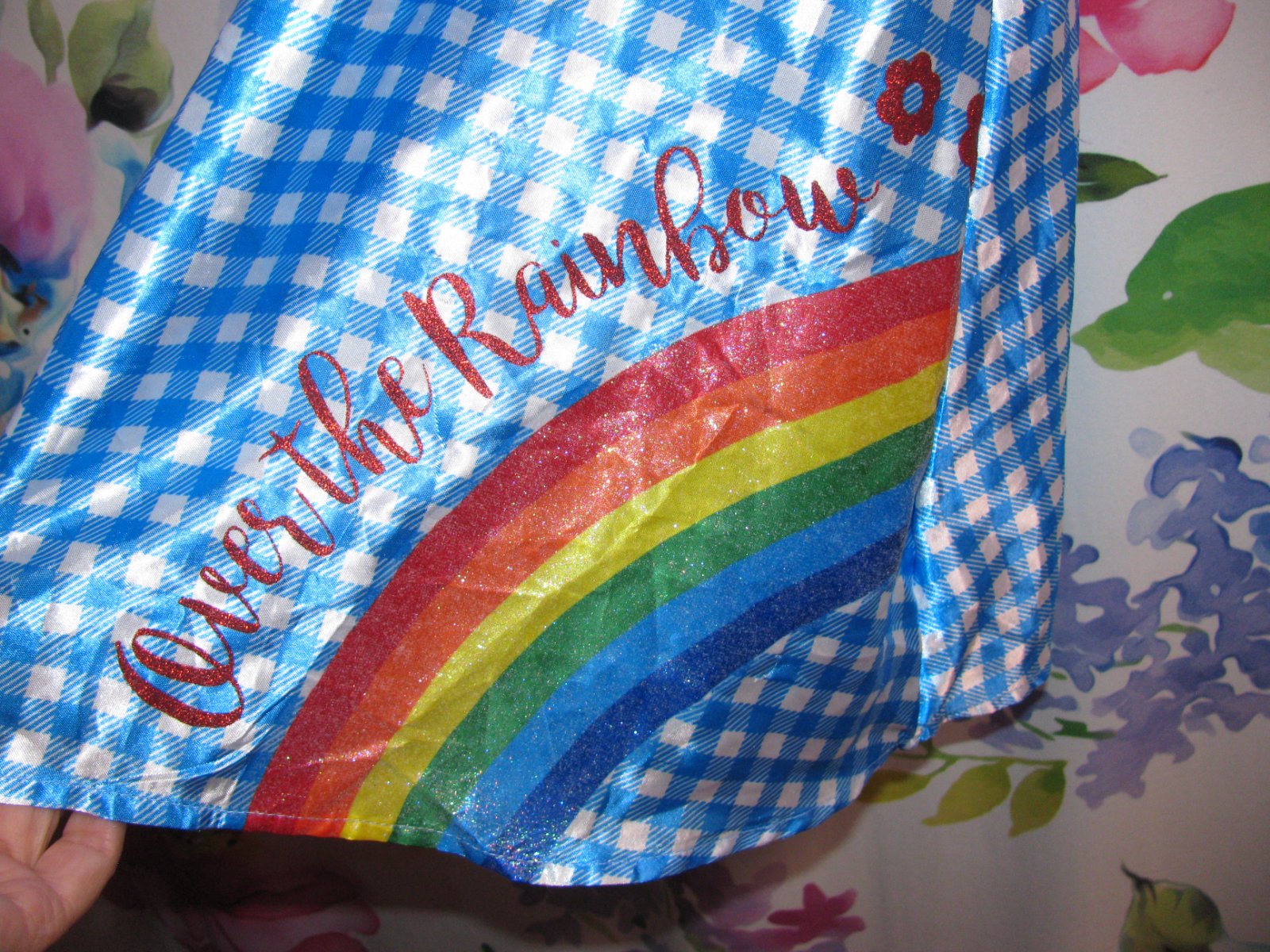 Báječné saténové šaty, třpytivá duha a nápisy, konce rukávů a v pase pružné do gumy, 100% polyester.