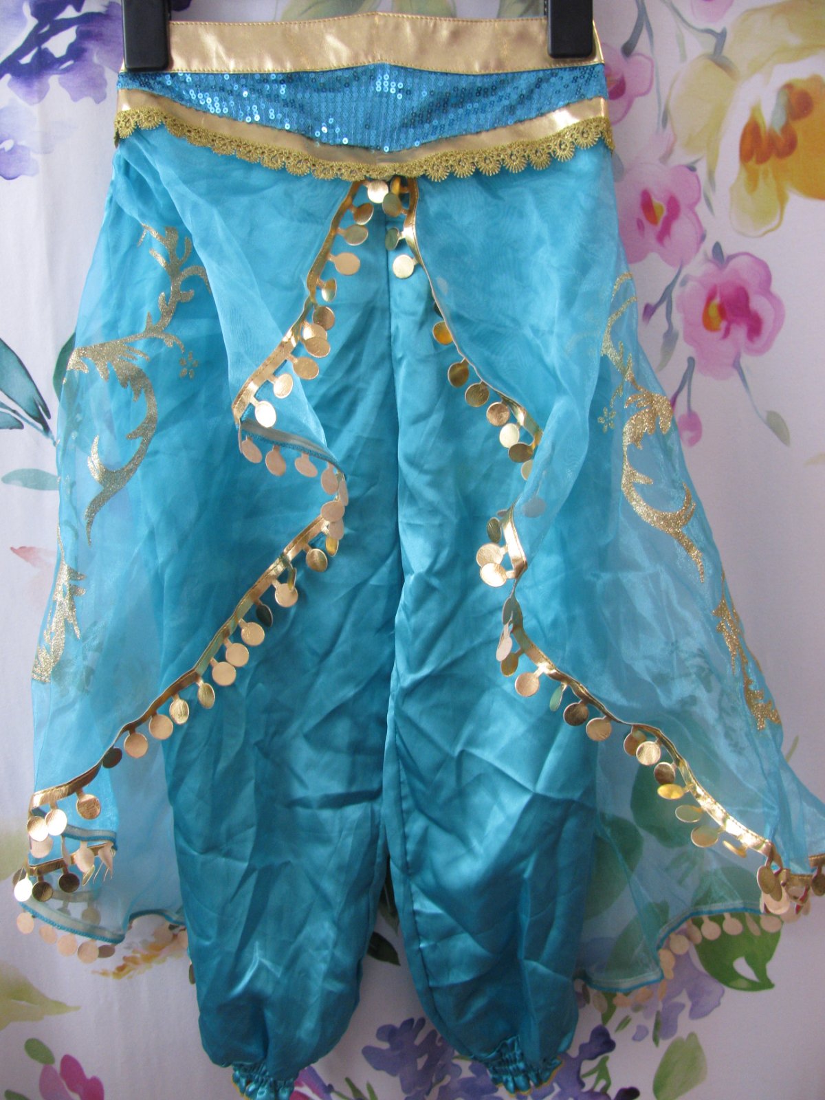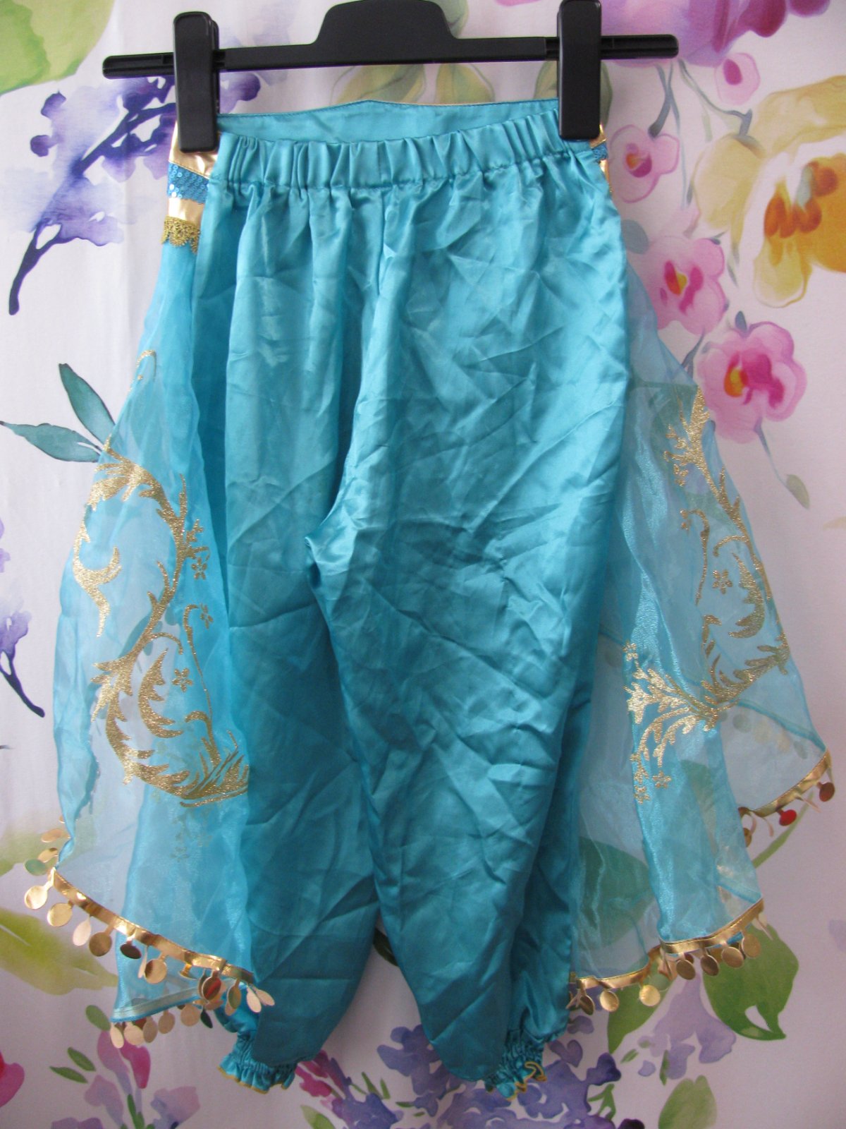Krásné kostýmové kalhoty ze saténu, zdobené tylem, zlatými ornamenty, flitry, v pase a kolem kotníků do gumy, 65% bavlna, 35% polyester. + Zlatá pružná čelenka. Top stav bez vady.