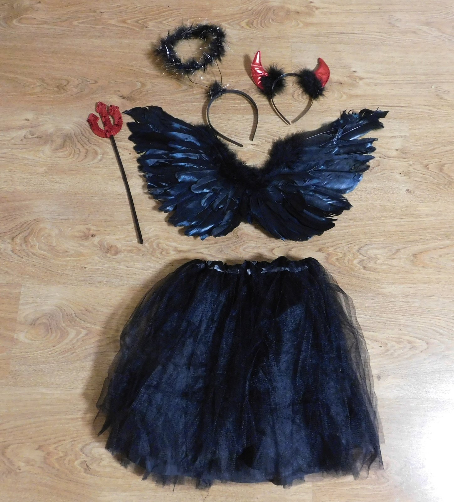 sukně pas 2x23/45cm,velikost křídel 55x30cm,na gumu,svatozář,hůlka,čelenka s rohy.Křídla lze libovolně otočit.Věk 7+,obleče i dospělák