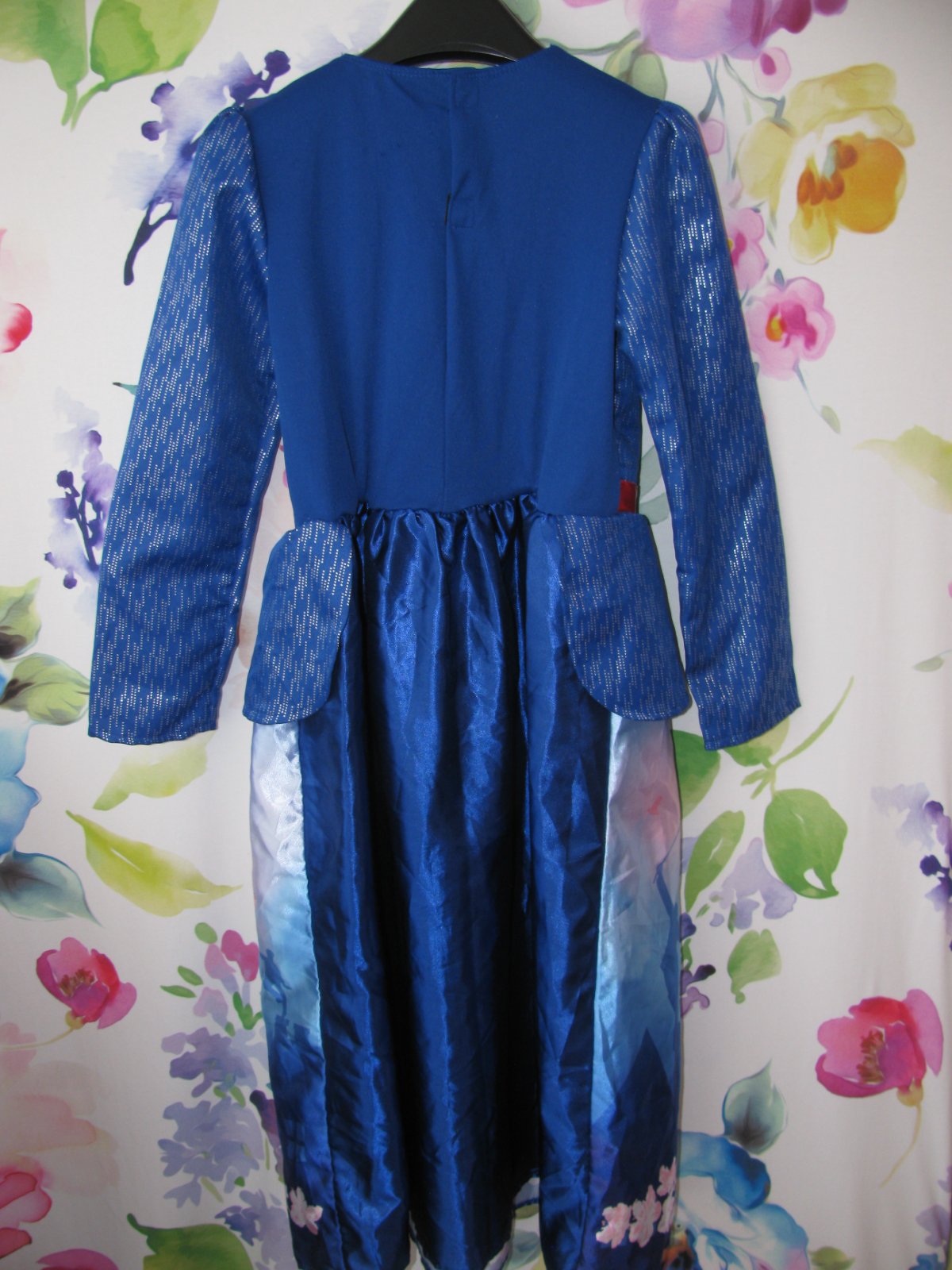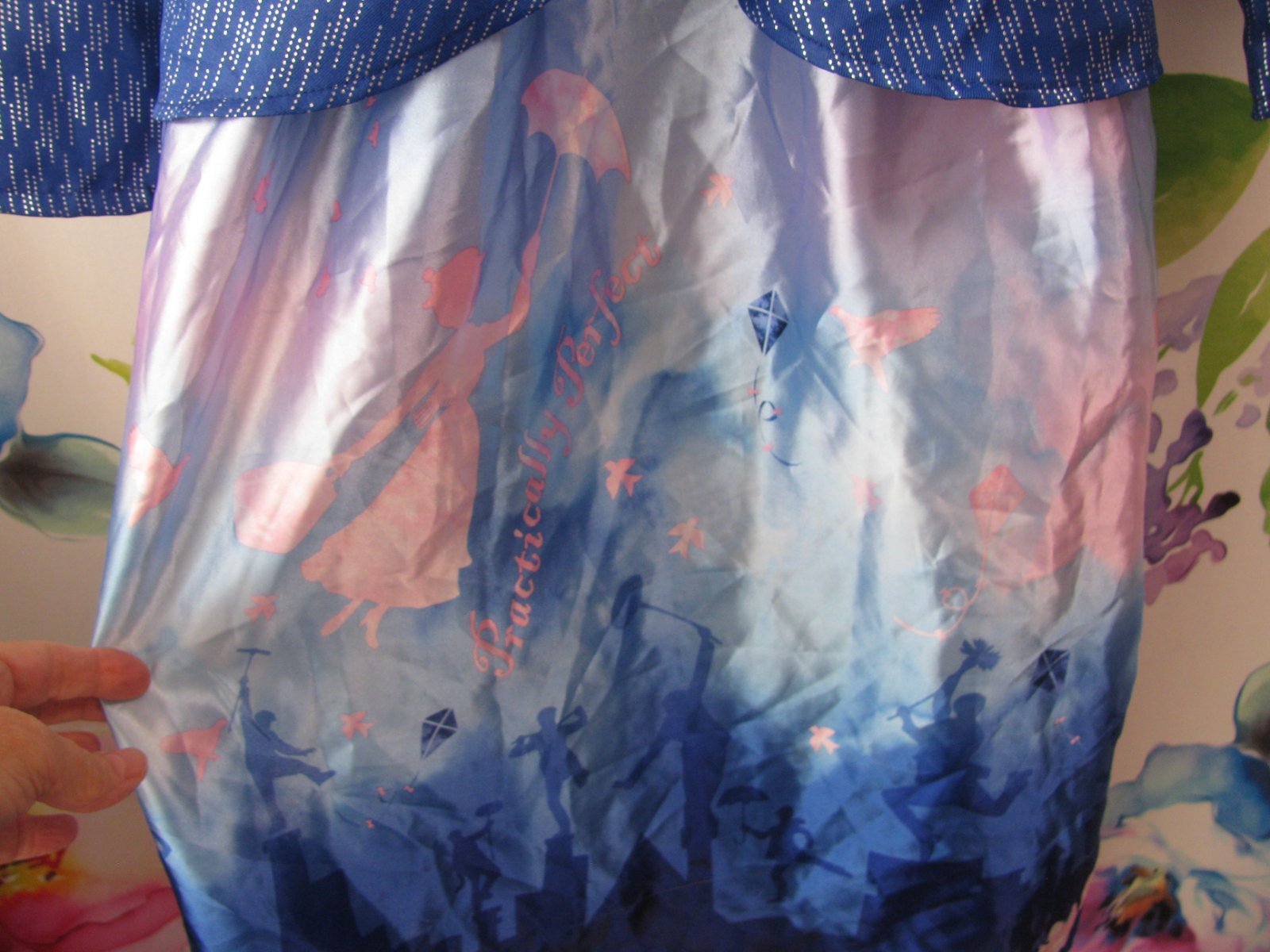 Krásné, saténové šaty, krásná malba s obrázky na sukni, našitý medailonek, za krkem zap. na suché zipy, v pase pružné do gumy, 100% polyester.
