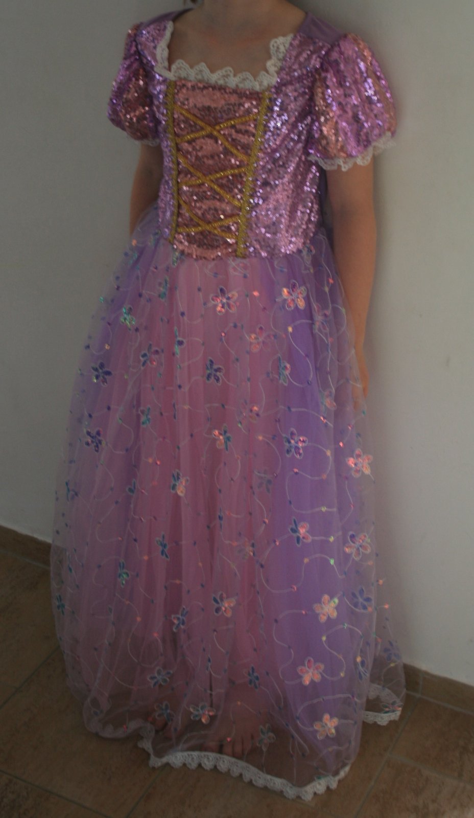 Prodám krásné šaty pro princeznu, velikost na štítku 150, ale je zřejmě pro menší (modelka na obrázku je vysoká 136 cm). Zdobené, růžovo-fialovo-zlaté. Cena bez poštovného.