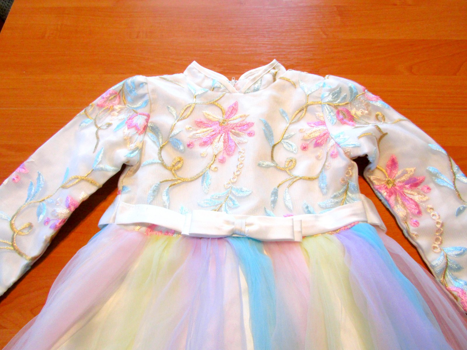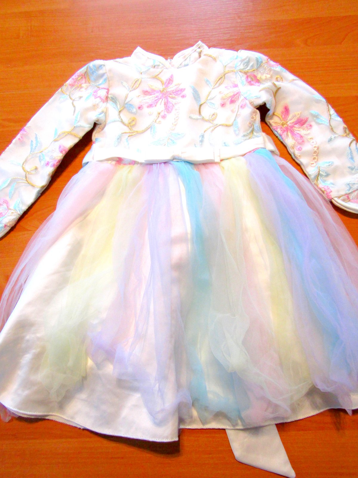 Sametové šaty s tylovou sukní, jsou v horní části z pružného sametu v barvách malinově růžové a žluté, kolem výstřihu je zdobí lem z duhových flitrů, v pase mají saténovou vázačku, sukýnka má podší...