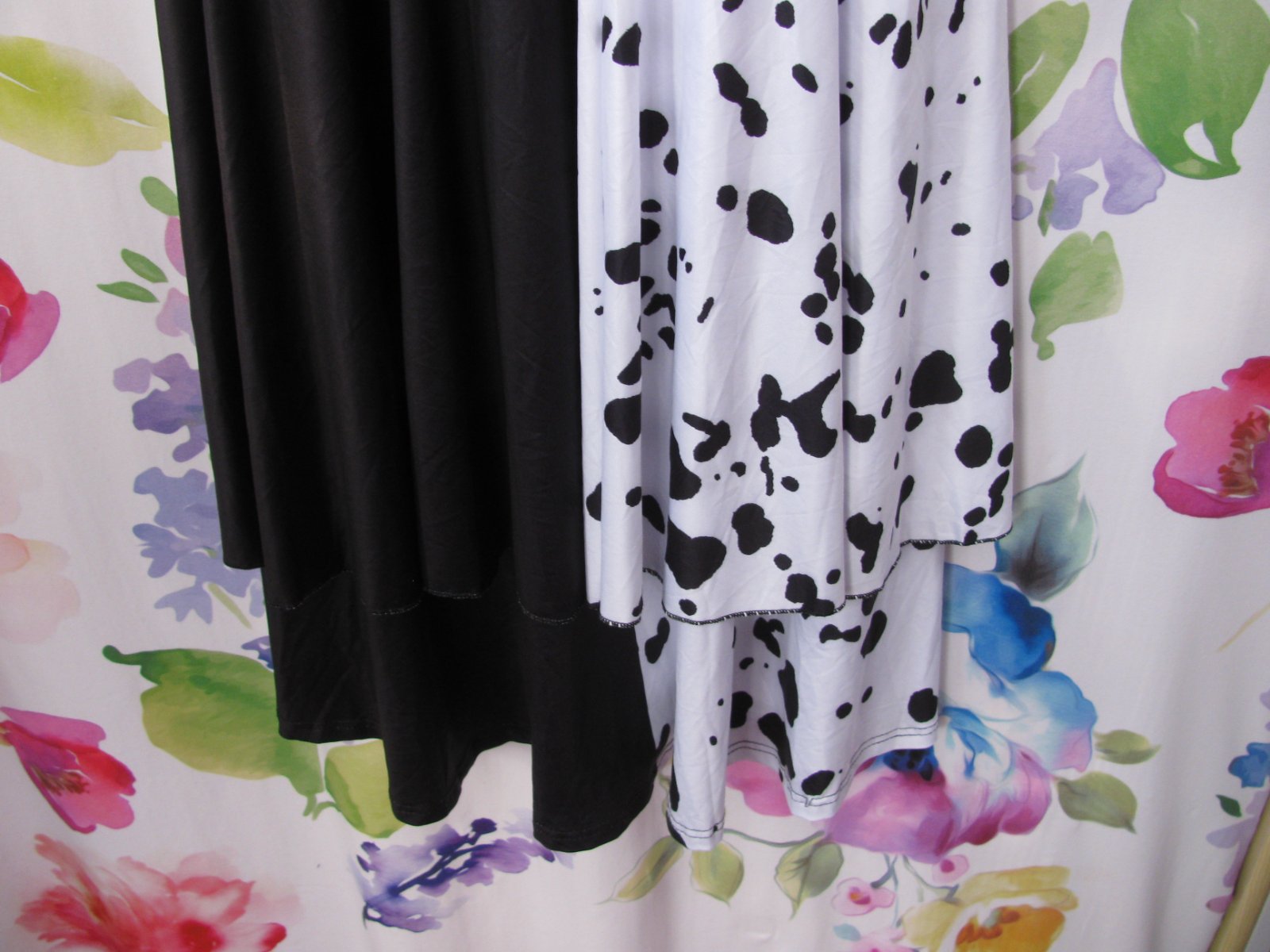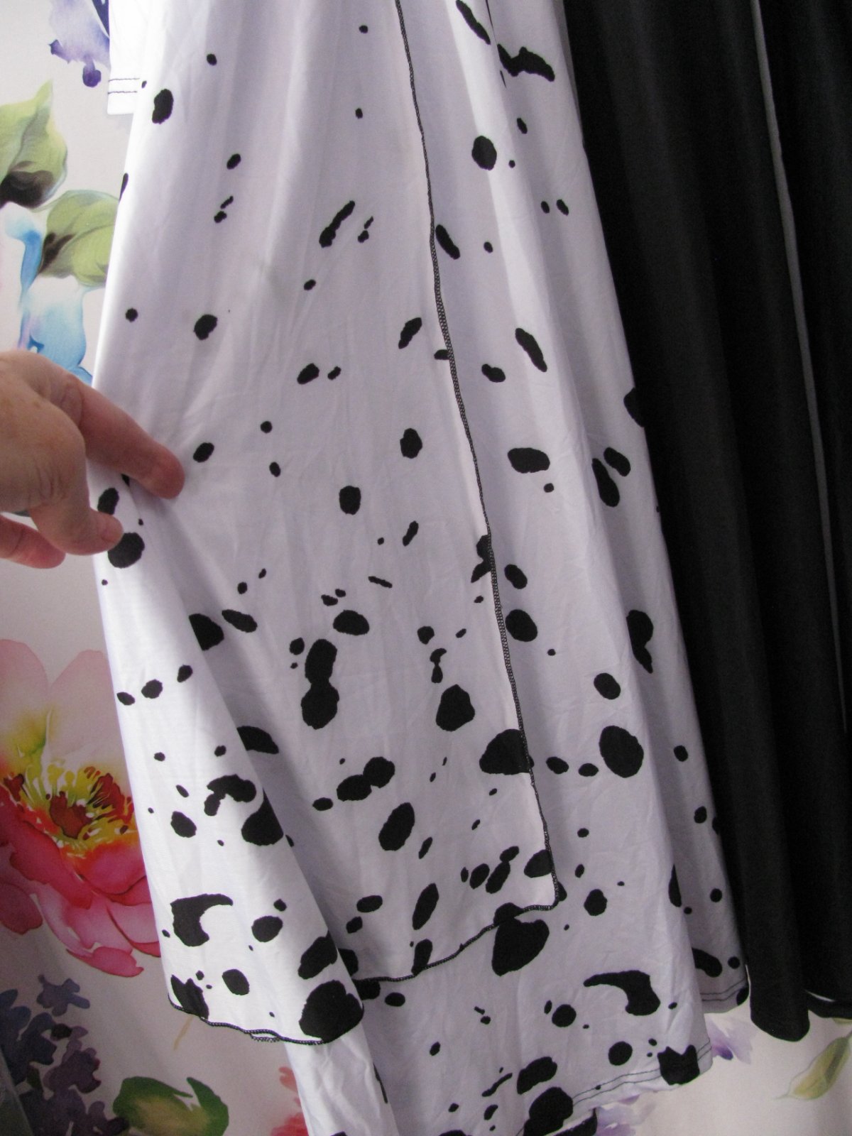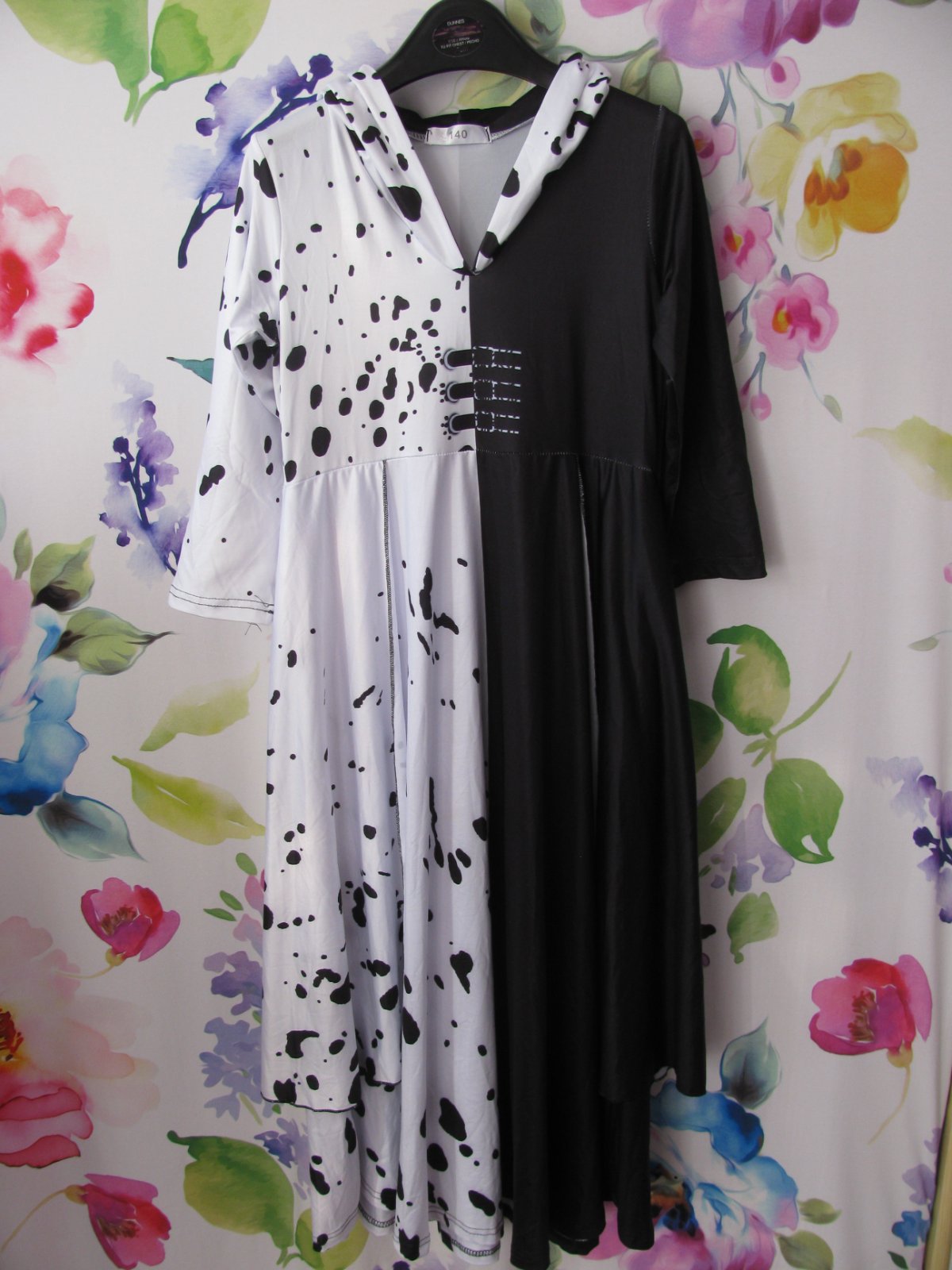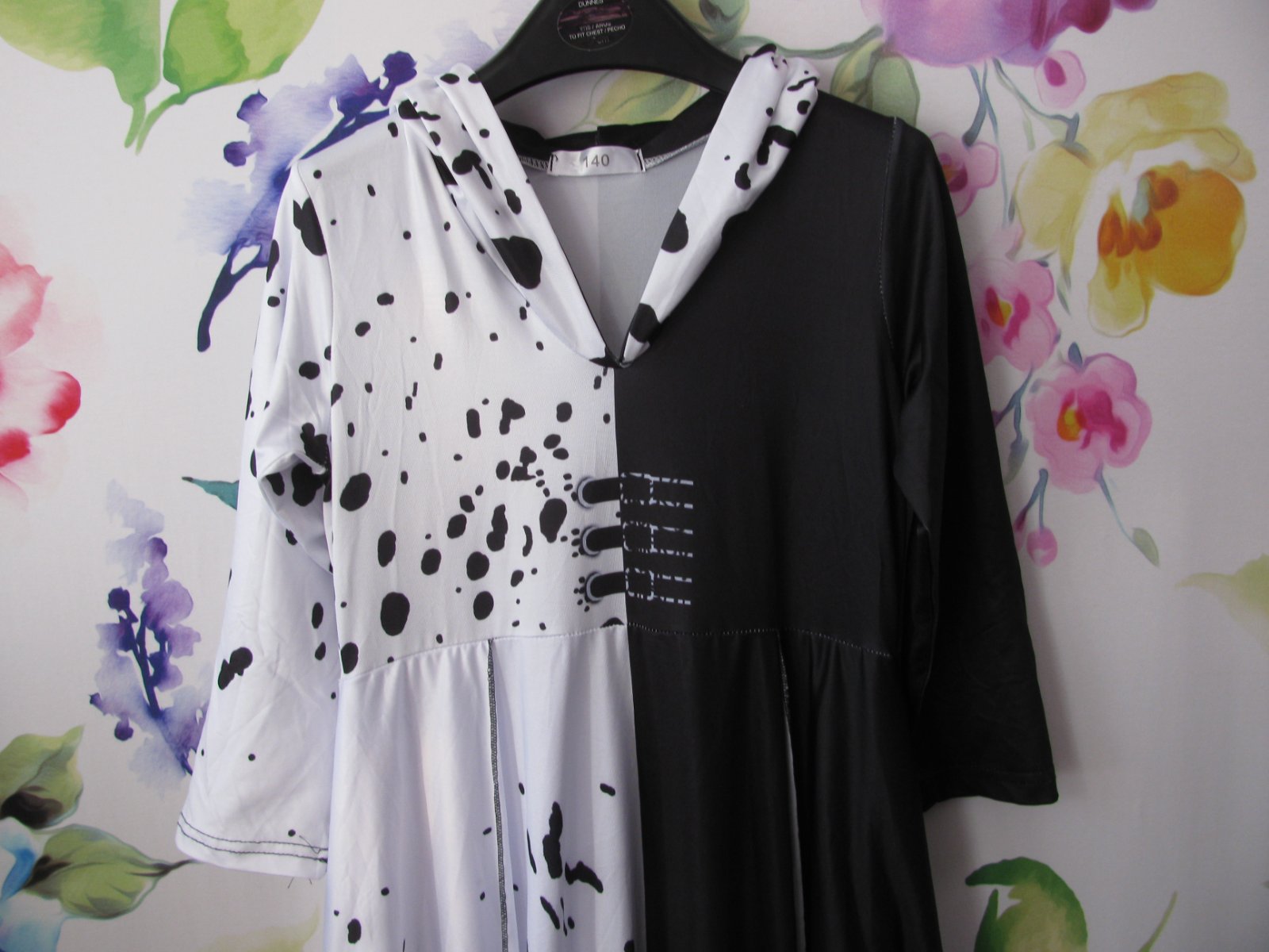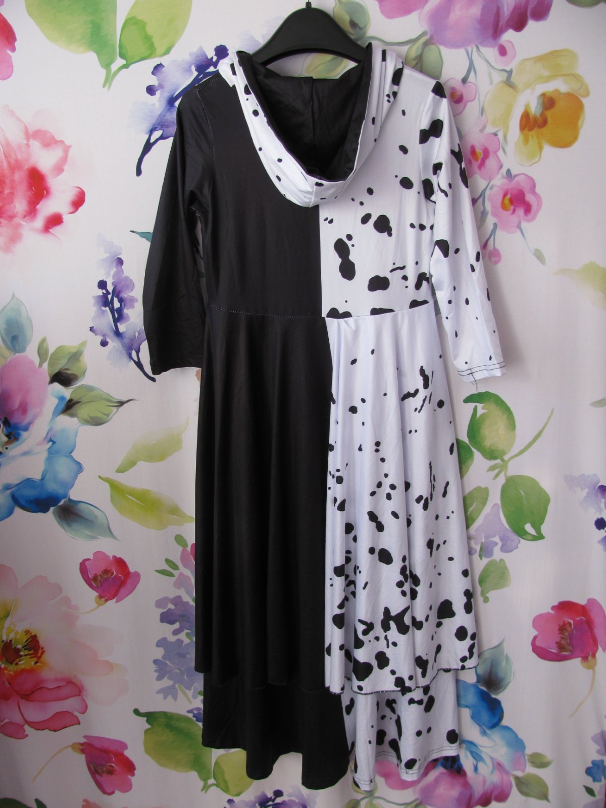 Luxusní černo bílé elastické šaty s kapucí, zajímavá, překládaná sukně. Cruella Deville, 88% polyester, 12% elastan.