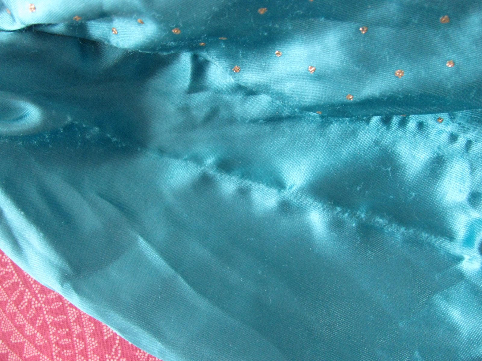 Saténové kalhoty, s třpytivými pavími péry, v pase a konce nohavic do gumy,100% polyester. Něco chloupek na vnitřní straně nohavic, jinak bez vady, krásný stav.