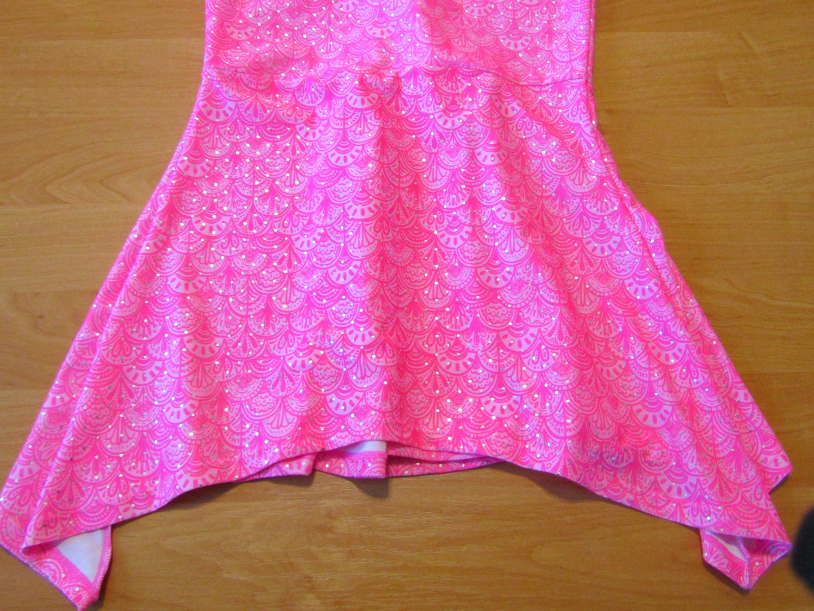Šatičky na 5-6 let,na zádech kolem suchého zipu pár žmolků,na tmavé látce není skoro vidět.Vepředu byla asi ozdoba,ta je utržená,jsou tam 2 dírky, půjdou zašít.