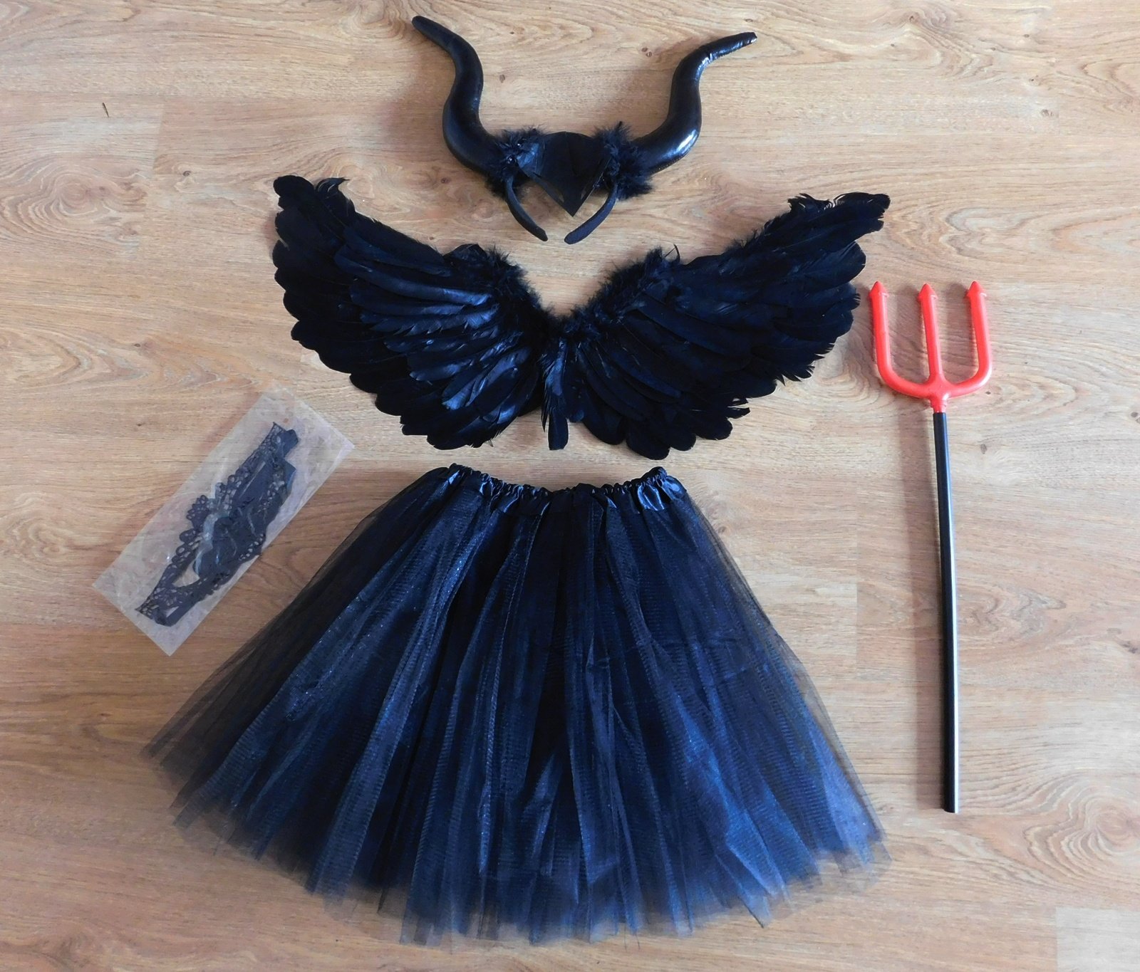 čelenka s rohy,sukně pas 2x22/50cm,křídla 60x30cm,maska na obličej,vidle