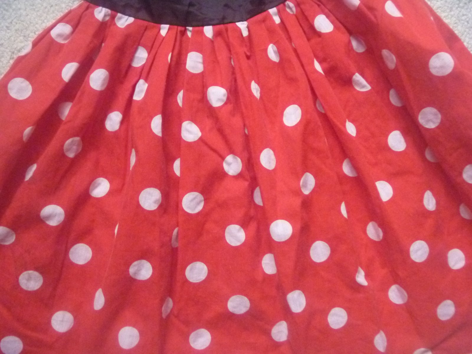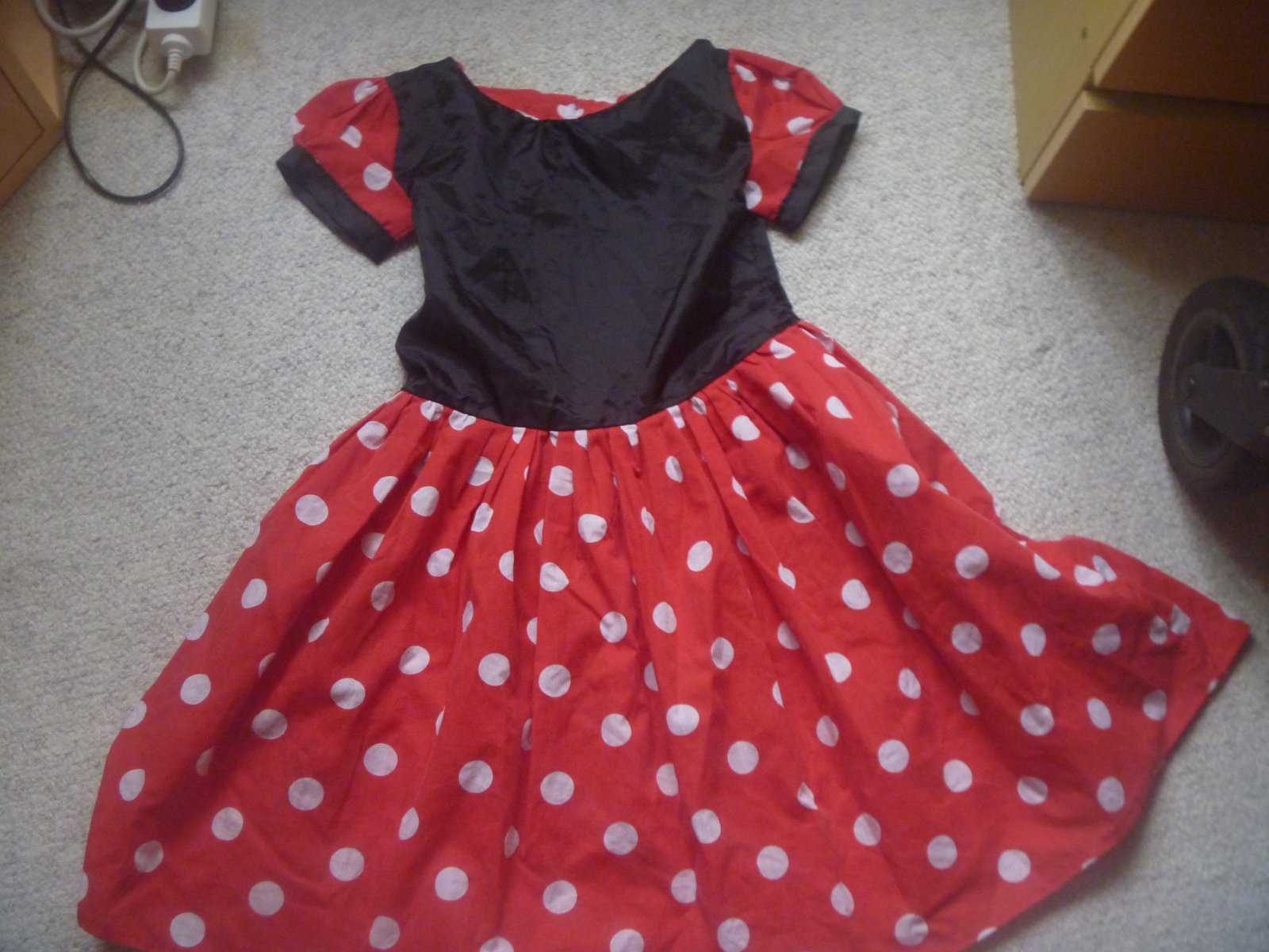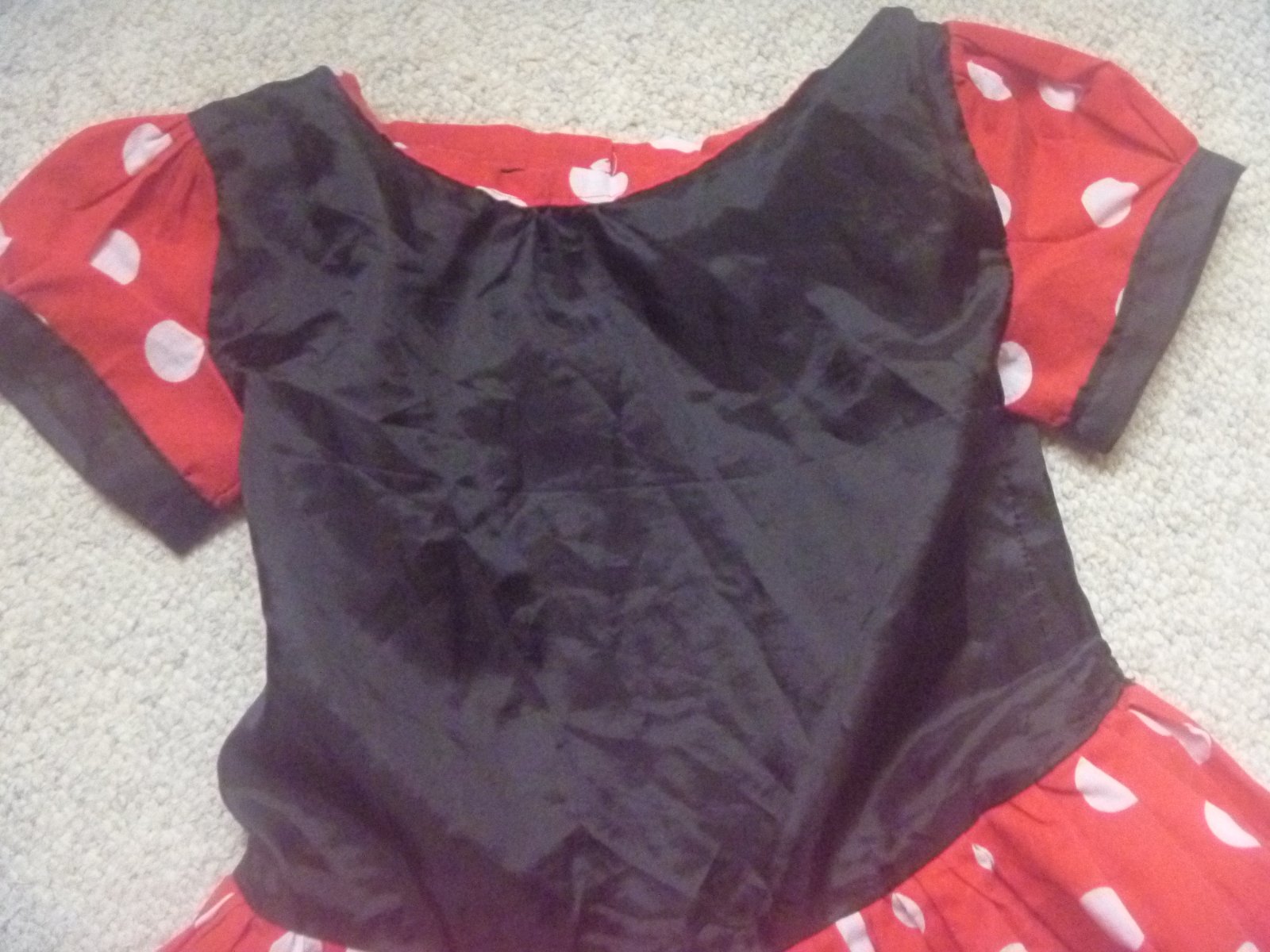 Prodám kostým Minnie, šaty s krátkým rukávem, černý vršek, červená sukně s velkými bílými puntíky, zapínání na zádech na 4 patentky, velikost 146, dobrý stav.