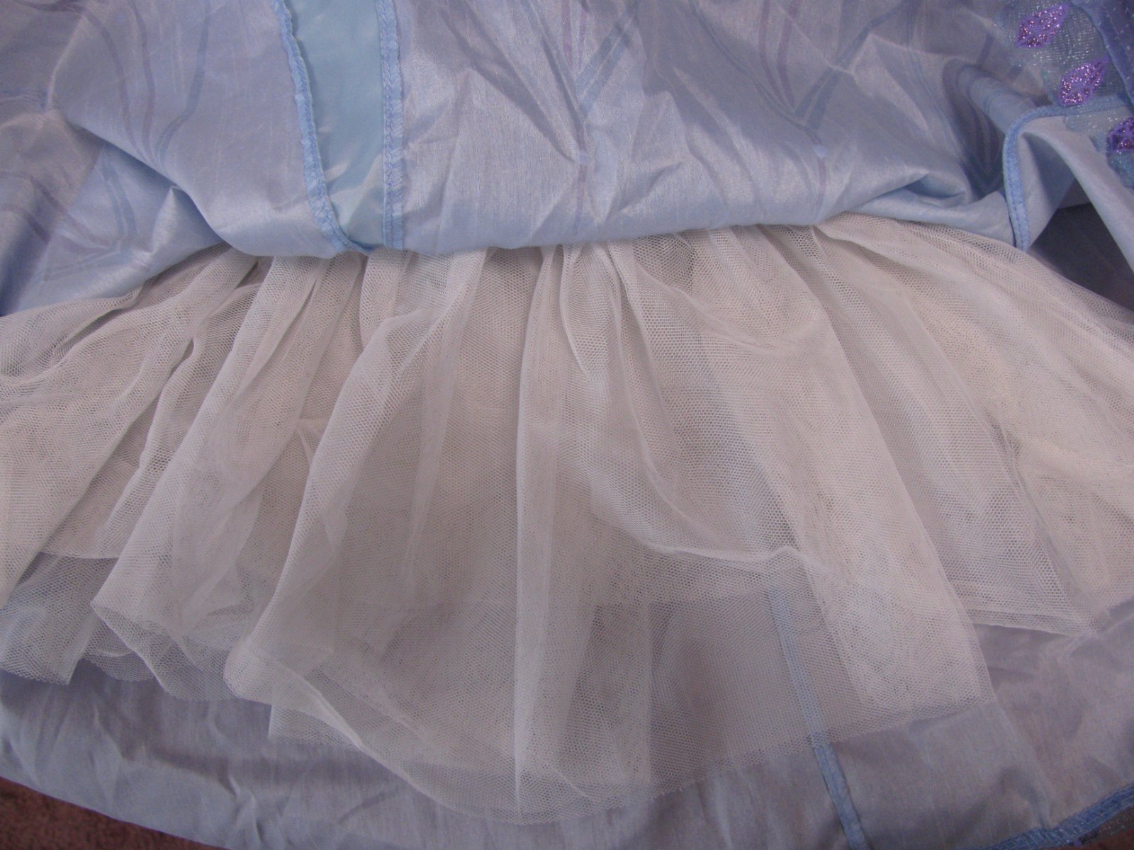 Krásné bledě modré šaty bez vlečky, třpytivé zdobení, kamínky, flitry, pružná záda, v pase pružné nejsou, za krkem zap. na suché zipy, tylová , nabíraná spodnička, 100% polyester. Trošku roztřepený okraj tylu na spodním lemu sukně -viz foto, jinak Krásný stav bez vad.