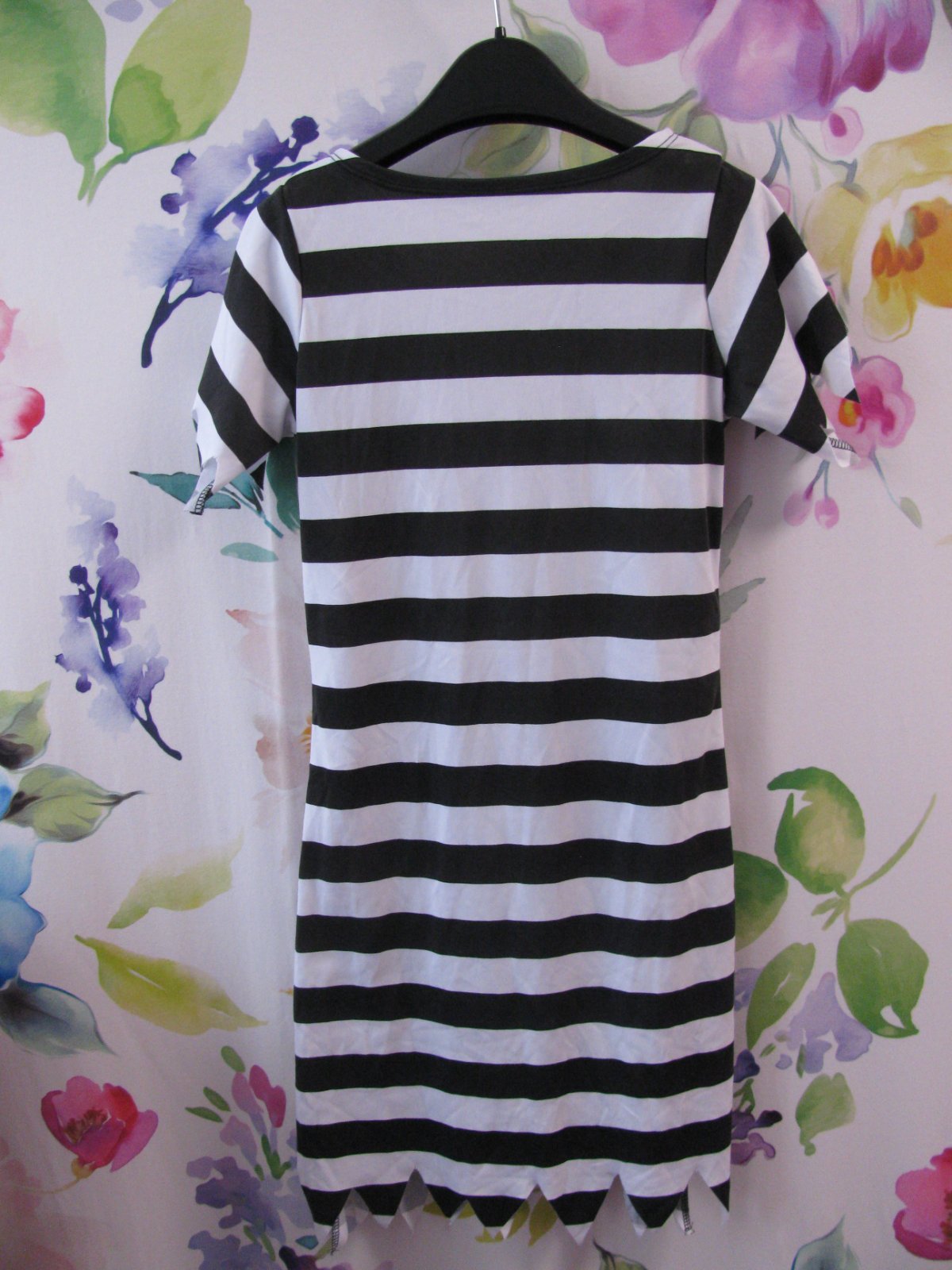 Elastické dívčí šaty, černo bílé, 100% polyester. U spodních průstřihů pár krátkých ažurek - viz foto,, jinak bez vady, moc hezký stav.