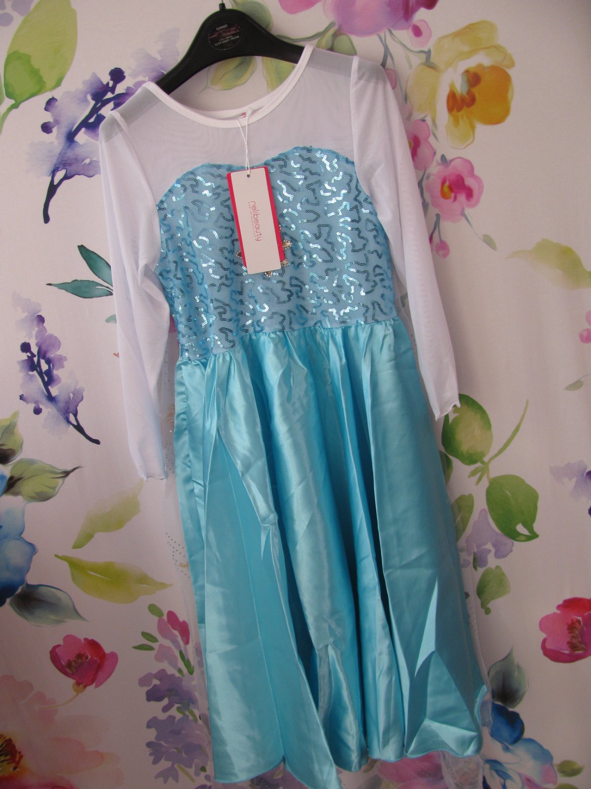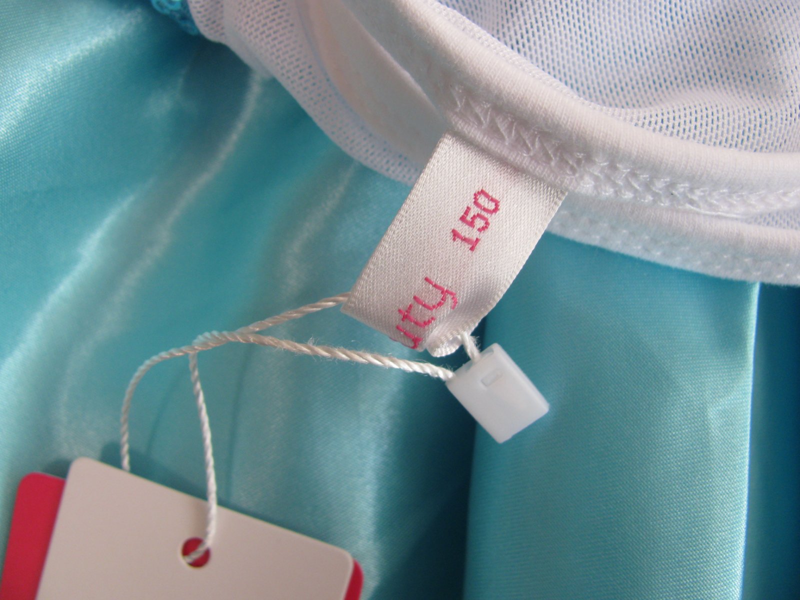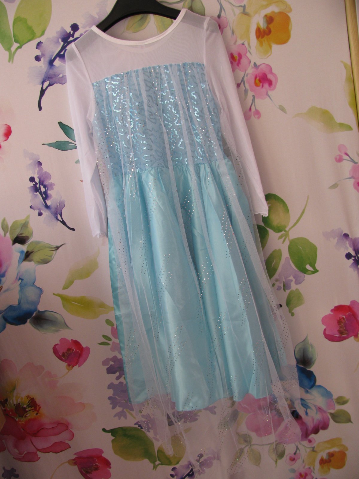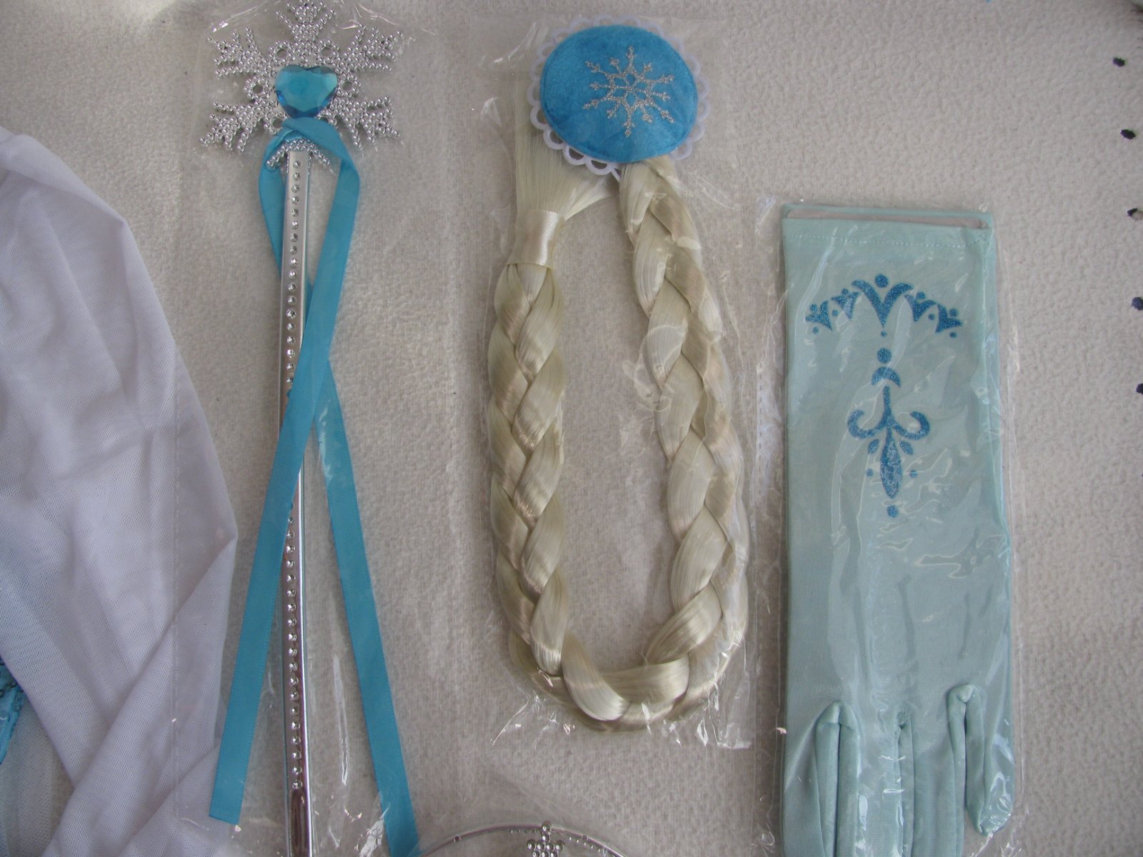 Nádherný saténový kostým, s dlouhou tylovou vlečkou s třpytkami, vlečka je na zádech přišitá, bolerko zdobené flitry, ledová vločka z kamínků a perliček, v pase pružné do gumy, bílé rukávy s části bolerka elastické. Ke kostýmu je korunka, čarovná hůlka, náhrdelník, náramek, prstýnek, náušnice, rukavice, vlasový cop. 100% polyester. Vhodné jako dárek.
