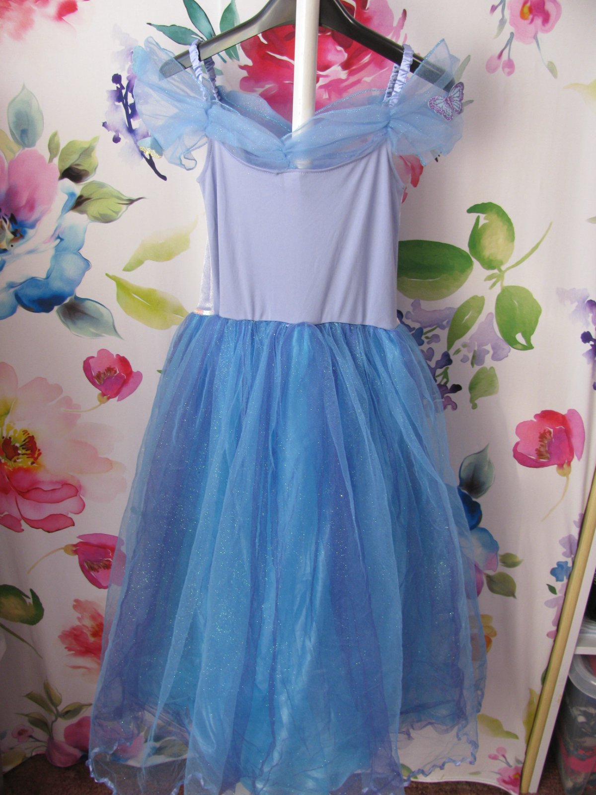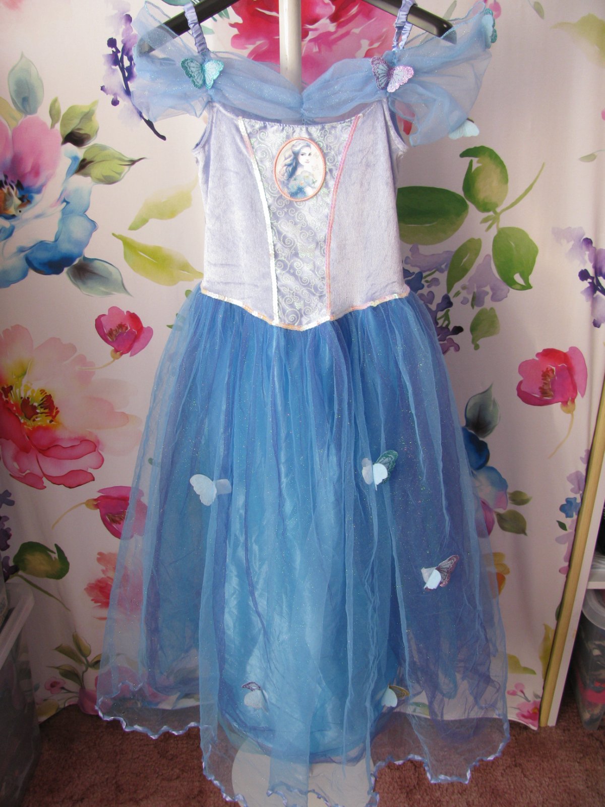 Nádherné třpytivé šaty s okružím,, bohatě zdobené tylem, krásnými motýlky, krásné třpytivé elastické velurové bolerko, lila barvička,flitry, obrázek Popelky, v pase pružné. 100% polyester. Našla jsem dvě milimetrové dírky, raději upozorňuji pro pořádek, zcela se ztratí ve velkém množství tylu, trochu pokřivené okruží, nemá to vliv na nošení.Jinak nádherný stav. Pravé princeznovské šaty.