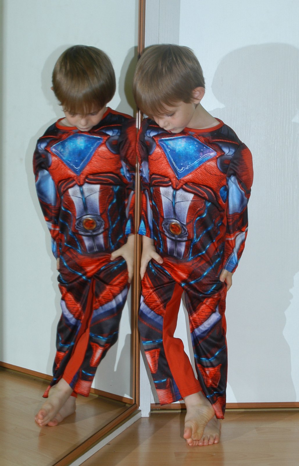 Karnevalový kostým Power rangers strážci vesmíru, je z pružného úpletu, v horní části má ramena a paže měkce postrované "vysvalené", zapíná se vzadu na suché zipy od nich má zatrhané nitky, jinak je v pořádku, vel. 3-4 roky, foceno na postavě s výškou 105 cm