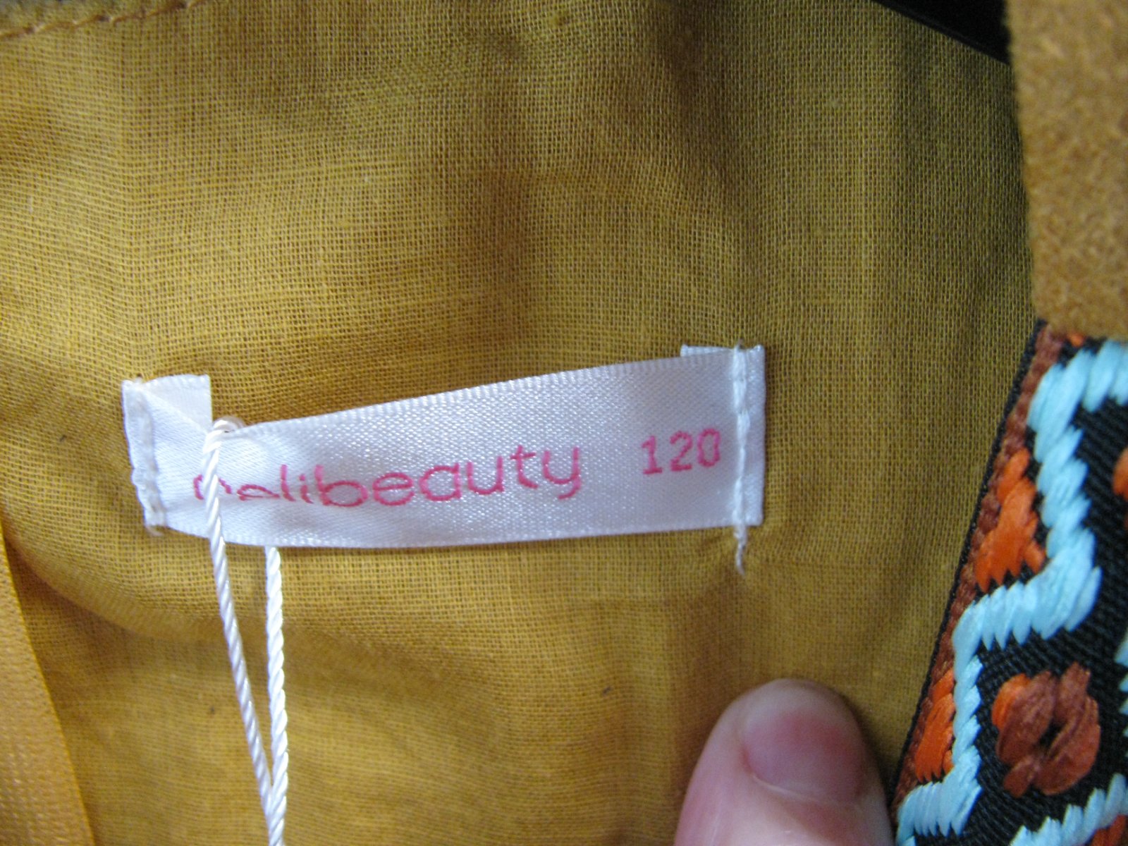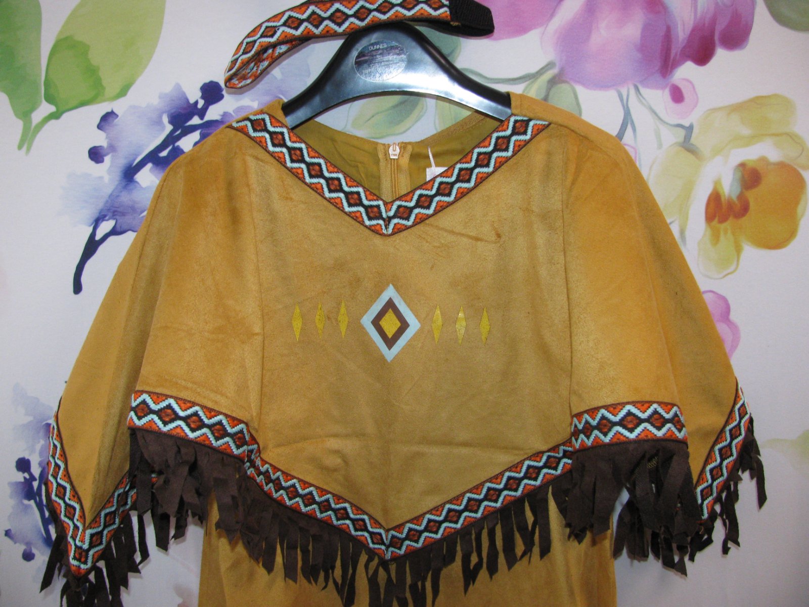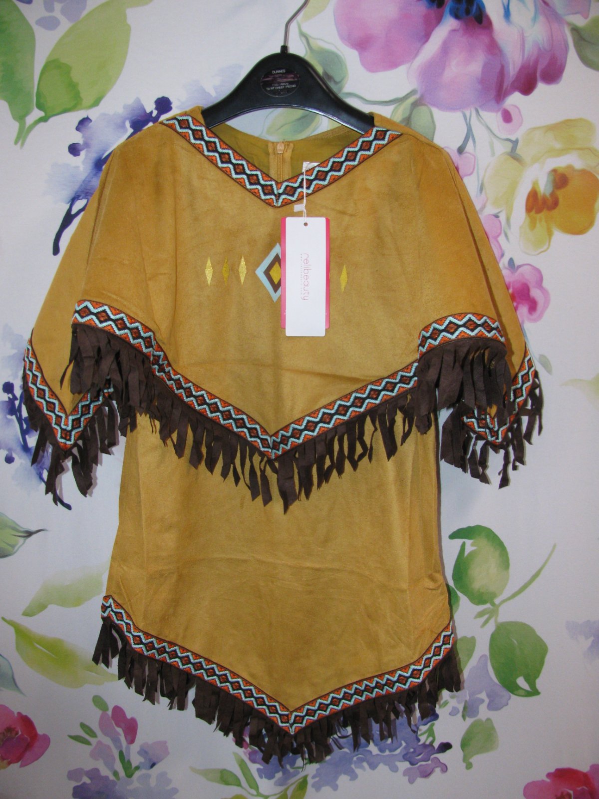 Krásný 3 dílný kostým na malou Indiánku, šaty, pončo a čelenka s péry. Šaty jsou v zadu na zip, v pase nejsou pružné, Pončo a pružná čelenka kolem hlavy. 100% polyester, 100% bavlna.